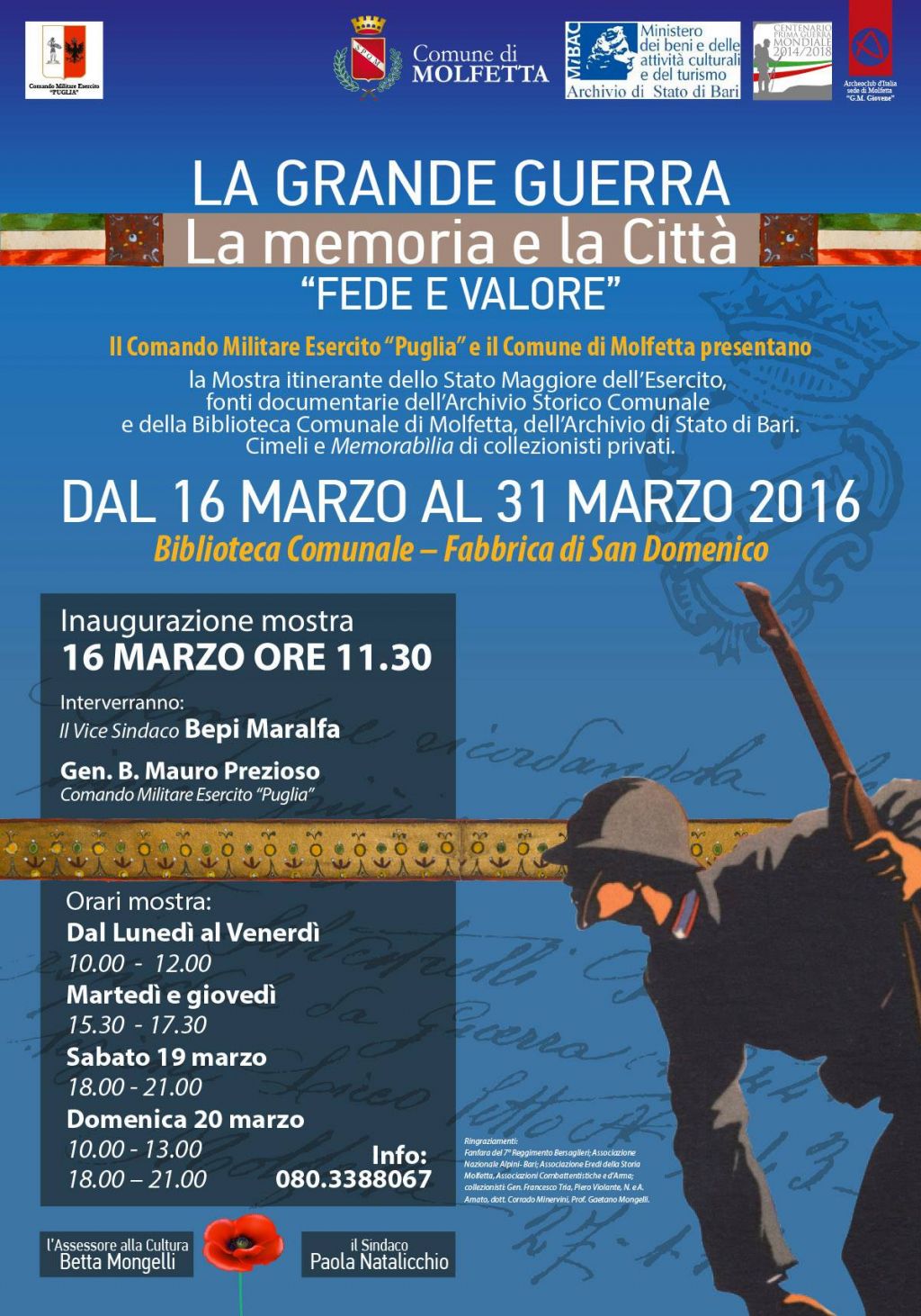 Manifesto_mostra_esercitoLa mostra itinerante dello Stato Maggiore dell'Esercito, "Fede e valore", arricchita dalle fonti documentarie dell'Archivio Storico Comunale e della Biblioteca Comunale di Molfetta, dell'Archivio di Stato di Bari approda a Molfetta nelle sale della biblioteca comunale presso Fabbrica di San Domenico. Sarà inaugurata il 16 marzo alle ore 11.30 con la partecipazione del Vice Sindaco di Molfetta Bepi Maralfa e del Generale di Brigata Mauro Prezioso, Comandante Regionale dell'Esercito in Puglia.