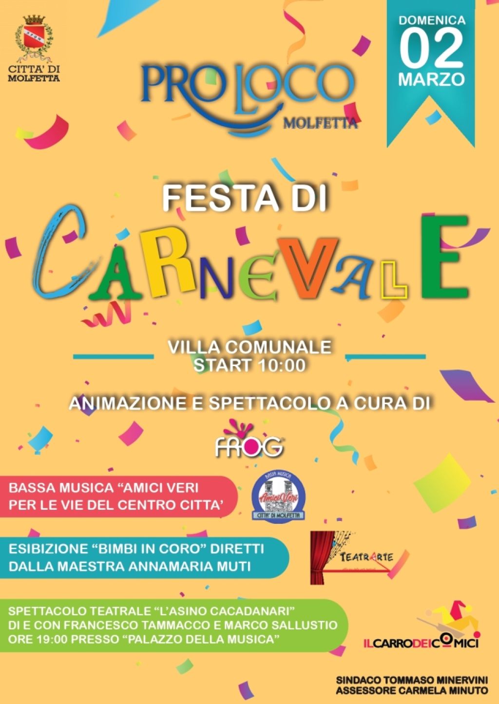 E le iniziative non finiscono qui. Domenica 2 marzo, in villa comunale, a partire dalle 10, con il patrocinio del Comune di Molfetta, assessorato al commercio, va in scena, fortemente voluta dall’assessore Carmela Minuto, la Festa di Carnevale con la Proloco.