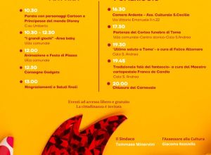 Prima la sfilata dei supereroi, delle mascotte Disney e delle principesse lungo Corso Umberto, poi lo spettacolo di animazione in Villa comunale e, per finire, la processione del Toma che si concluderà con l’incendio del fantoccio impagliato a Cala sant’Andrea con la partecipazione di Felice Altomare e del maestro cartapestaio Francesco de Candia.