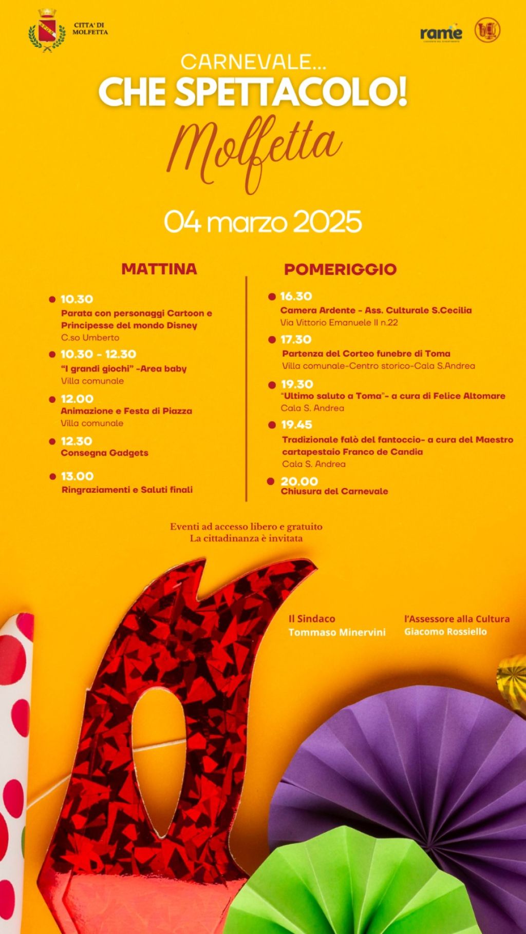 «Puntiamo al divertimento per i più piccoli e alla conservazione delle tradizioni legate al funerale del fantoccio Toma, ma anche al coinvolgimento del territorio e delle professionalità del territorio – il commento del Sindaco, Tommaso Minervini, e dell’assessore alla cultura Giacomo Rossiello – abbiamo accolto positivamente le proposte che ci sono giunte da Ramè e dall’associazione Santa Cecilia. Puntiamo ad offrire alla città un ventaglio di iniziative che coprano l’intero arco dell’anno, con il MolFest, Battiti live, i grandi concerti, gli appuntamenti culturali e non potevamo non considerare anche il Carnevale. Con il funerale del fantoccio Toma chiudiamo la parte più folcloristica e ci prepariamo alla Quaresima con il mercoledì delle ceneri».