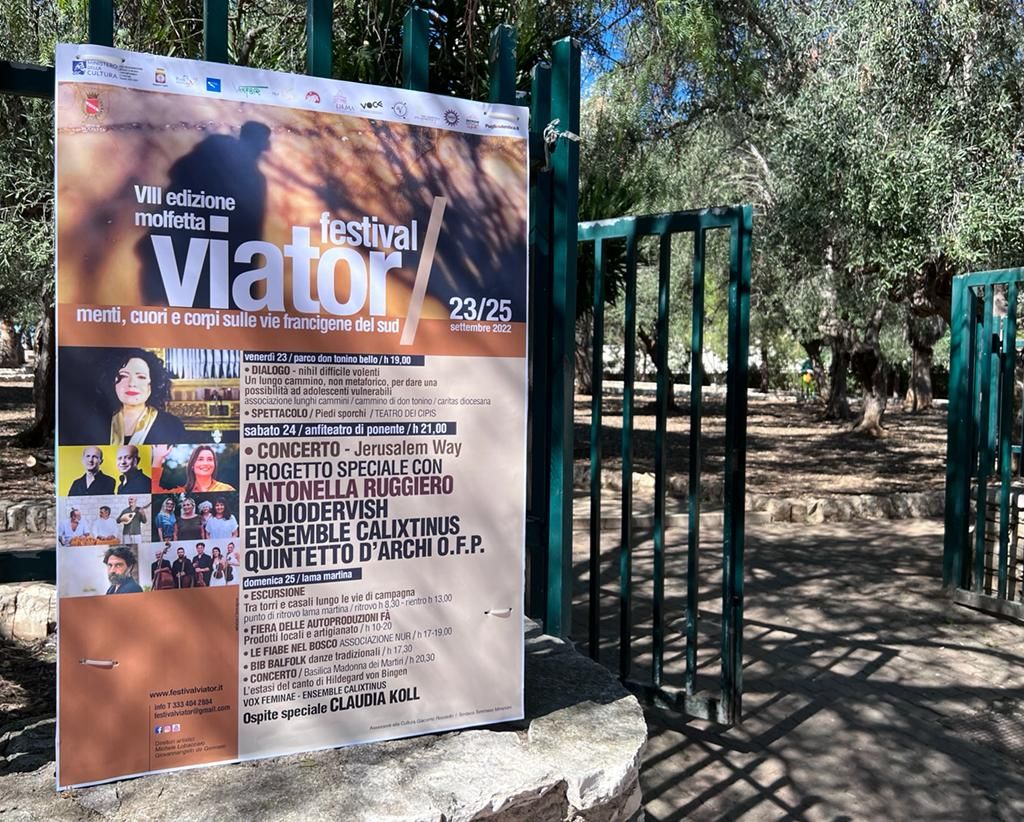 Si apre così domani, venerdì 23 settembre prossimo, con due appuntamenti, a partire dalle 19, presso il Parco Don Tonino Bello in via Pio la Torre, il Festival Viator che, si terrà a Molfetta dal 23 al 25 settembre prossimo.