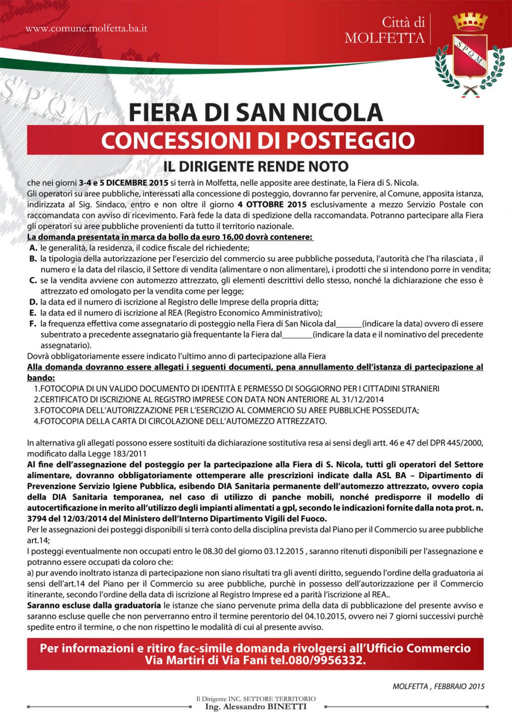 che nei giorni 3-4 e 5 DICEMBRE 2015 si terrà in Molfetta, nelle apposite aree destinate, la Fiera di S. Nicola.