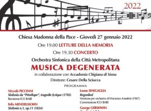 Ha un titolo provocatorio “Musica degenerata”, il concerto che, giovedì 27 gennaio, a partire dalle 19, in occasione della Giornata della memoria, l’orchestra sinfonica della Città metropolitana terrà nella Chiesa Madonna della pace.