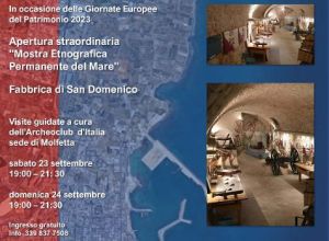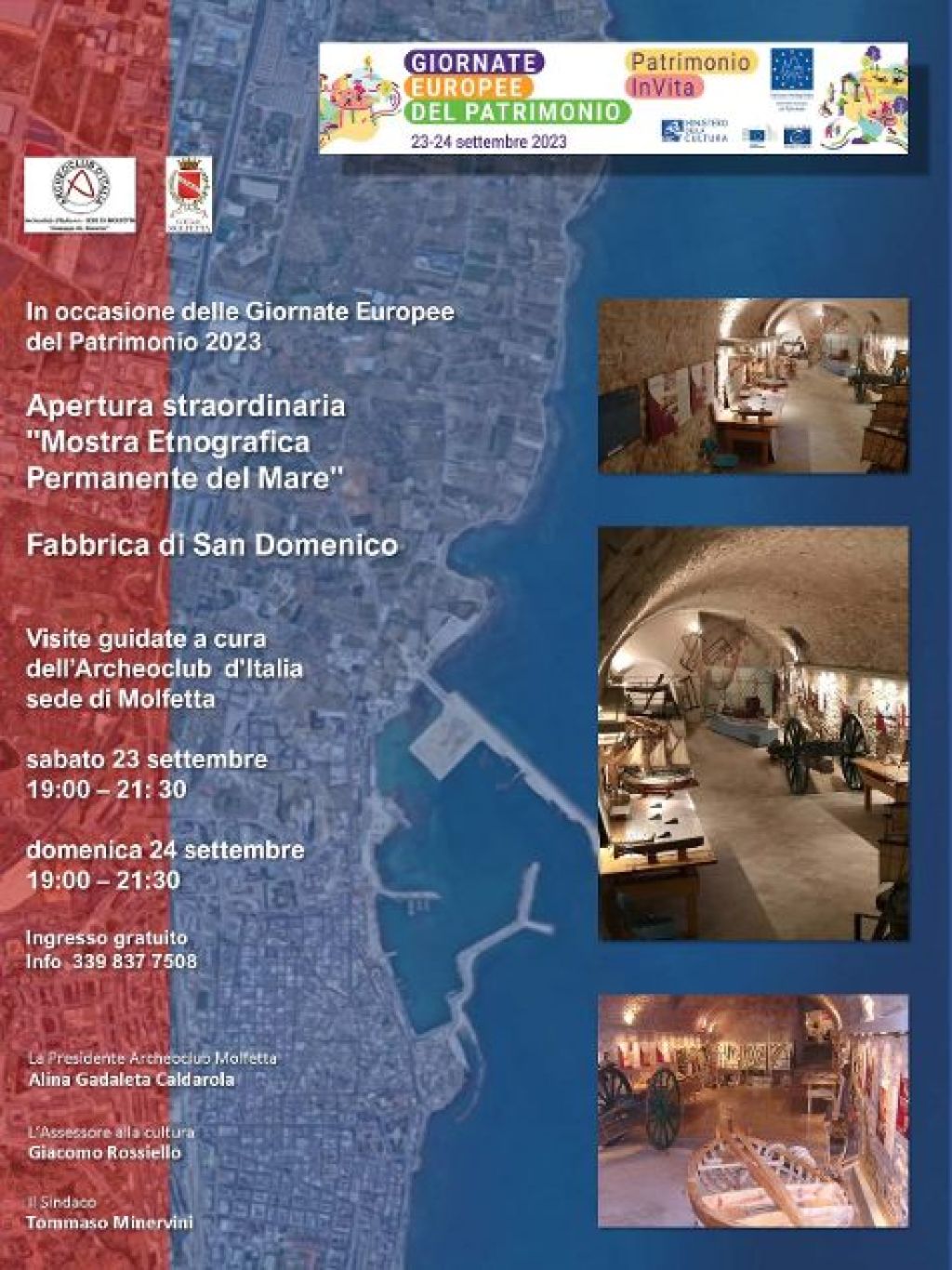 Molfetta, antica città marinara del basso Adriatico, vi partecipa con l’apertura straordinaria della Mostra Etnografica permanente del mare, piccolo museo, unico nel suo genere, dedicato al patrimonio culturale, materiale e immateriale, della gente di mare, nel piano interrato della Fabbrica di San Domenico.