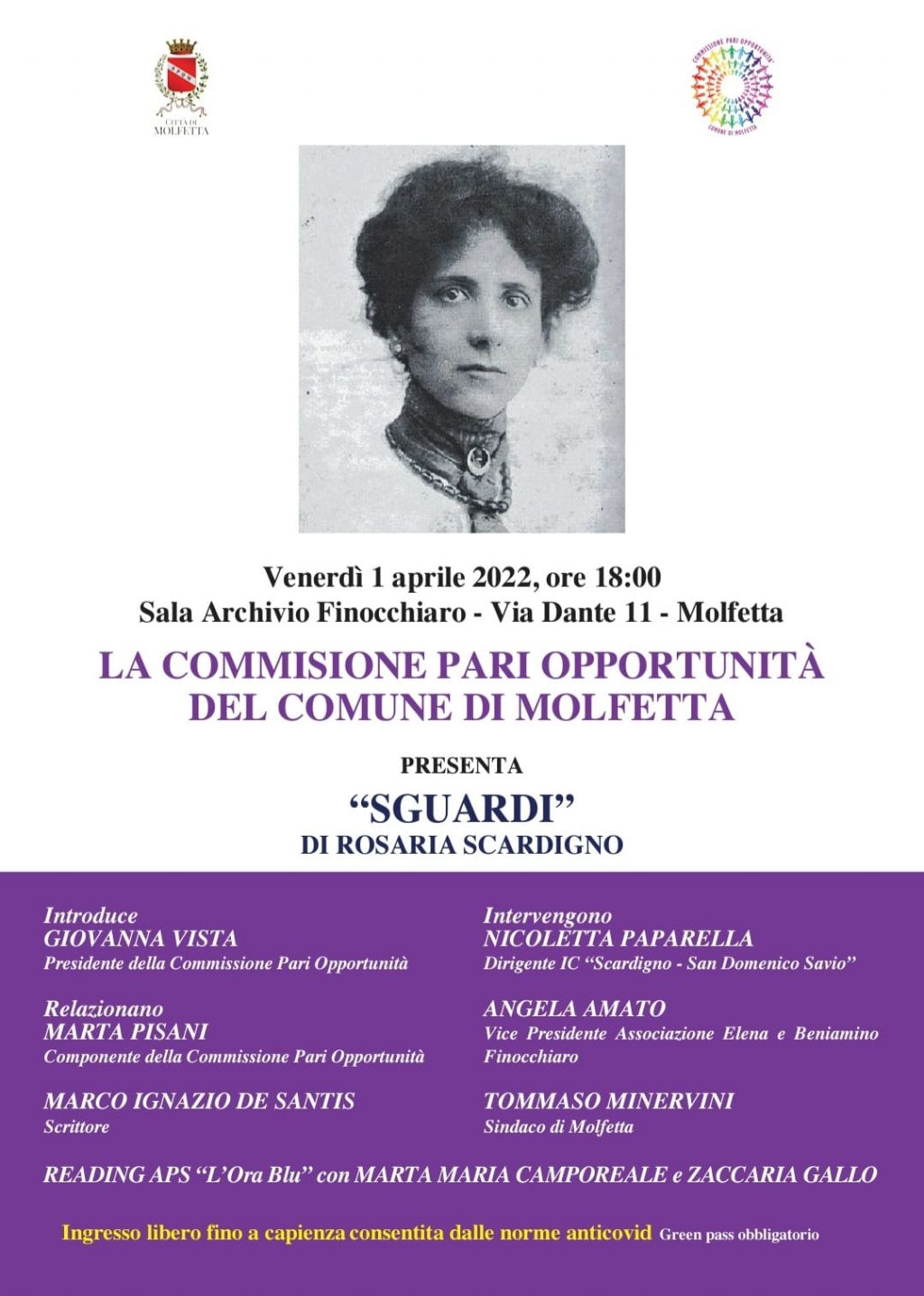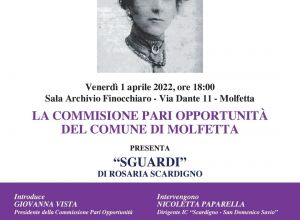 Venerdi, 1 aprile 2022, alle ore 18,00, presso la Sala Archivio Finocchiaro, via Dante 11 a Molfetta, la Commissione Pari Opportunità del Comune di Molfetta, con il patrocinio del Comune di Molfetta, presenta “Sguardi”, opera letteraria di Rosaria Scardigno.