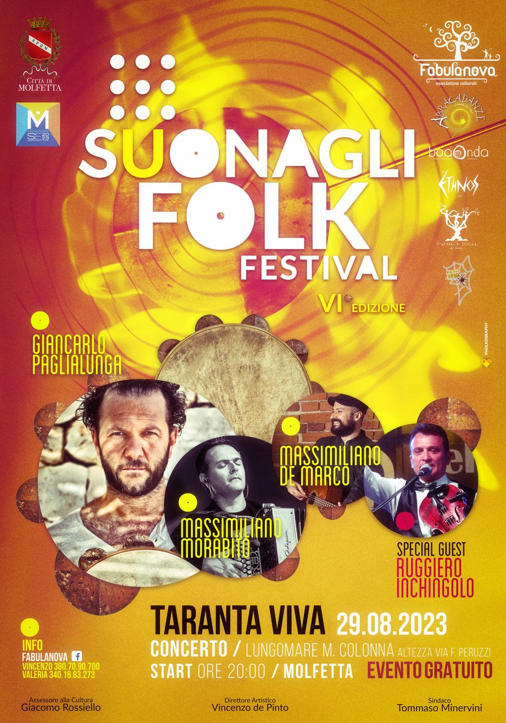 Compie sei anni e, il 29 agosto, alle 20, approda sul Lungomare Colonna (il cambio di location si è reso necessario in virtù della prevedibile partecipazione di pubblico), il Suonagli Folk festival, la manifestazione che, ogni estate, fa saltellare migliaia di persone giunte apposta anche da fuori città e oltre.