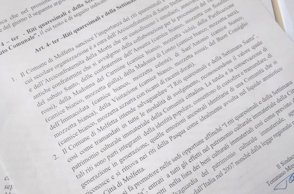 Il Comune di Molfetta, facendo proprie e condividendo le istanze giunte da più parti della Città e dello stesso Consiglio comunale, si prepara a candidare, anche sulla base della Legge regionale, numero 8 del 2020, i Riti della Settimana di Passione e quelli della Settimana Santa perché entrino a far parte del patrimonio dei beni immateriali.