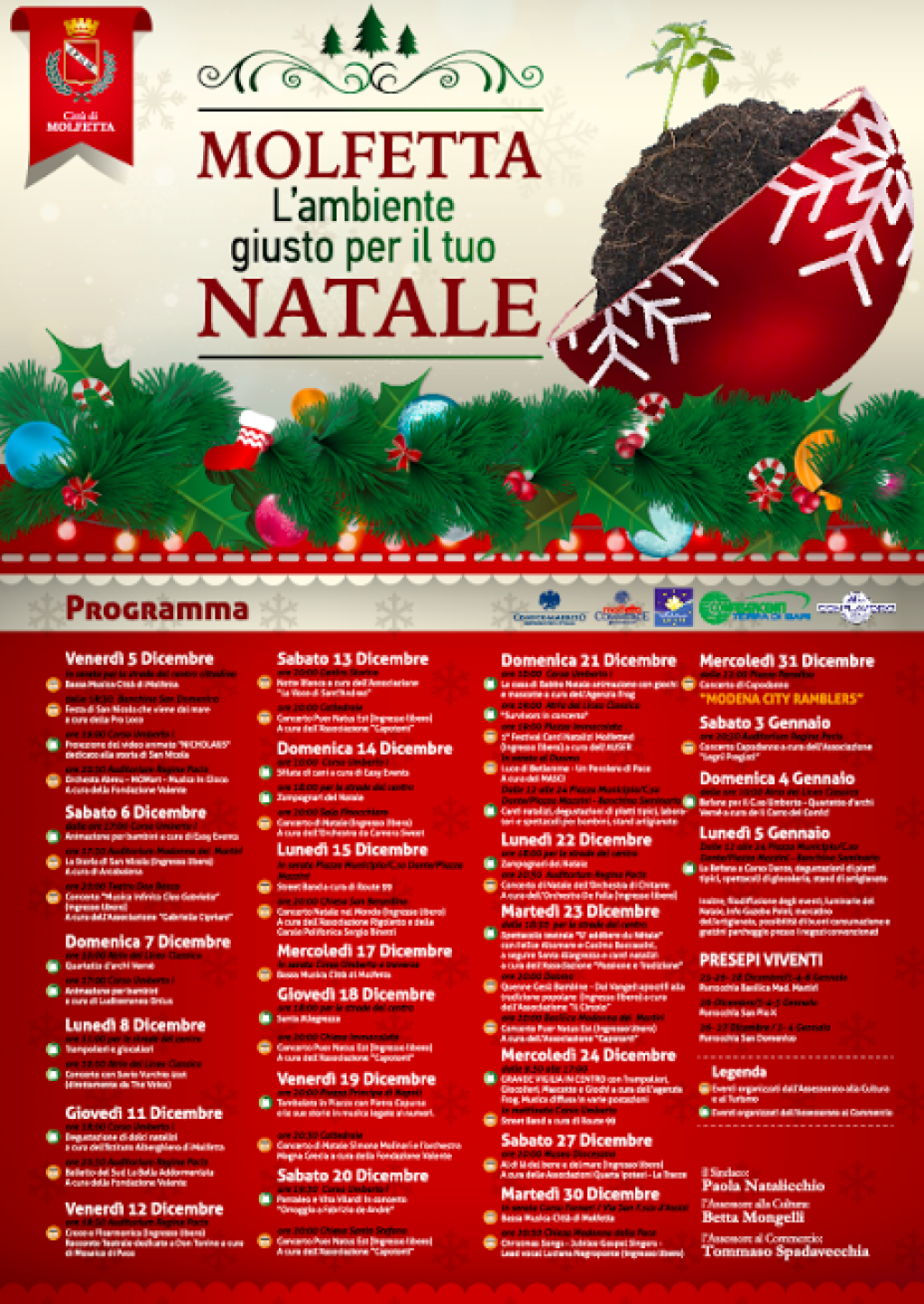 Il capodanno in piazza con i Modena City Ramblers è l'evento di punta di un cartellone di eventi presentato questa mattina in conferenza stampa dal sindaco Paola Natalicchio. Ma a Molfetta ci sarà anche spazio fino al 6 gennaio per la musica classica con Francesco Manara, primo violino dell'orchestra del Teatro alla Scala; l'11 dicembre con"La bella addormentata" del Balletto del Sud; il 12 dicembre con l'evento dedicato a don Tonino che vedrà la presenza di padre Alex Zanotelli e dello spettacolo teatrale "Croce e Fisamornica"; il 13 dicembre la notte bianca del teatro con spettacoli teatrali diffusi in tutto il centro storico; il 19 dicembre Simona Molinari e l'orchestra della Magna Grecia, il 30 dicembre i Jubilee Gospel Singers con lead vocal Luciana Negroponte e poi eventistica diffusa in città per le famiglie e i bambini in collaborazione con tutte le associazioni dei commercianti per restituire nuova centralità al commercio cittadino."Un calendario di 23 giornate con 47 appuntamenti. Abbiamo l'ambizione di rilanciare il turismo e ridare fiato al commercio cittadino. Natale e Capodanno sono un'occasione di attrattività importante. Molfetta saprà accogliere chi vorrà vivere le sue strade e le sue piazze con eventi teatrali e giochi di strada, canti della tradizione natalizia, profumi e sapori della gastronomia locale, manufatti dei nostri artigiani. Per questo abbiamo messo l'eventistica al servizio della città, con un protocollo con tutte le associazioni dei commercianti immaginando questo percorso con l'assessorato alla cultura e al commercio". Così il sindaco di Molfetta Paola Natalicchio, questa mattina e con lei appunto gli assessori Betta Mongelli e Tommaso Spadavecchia.