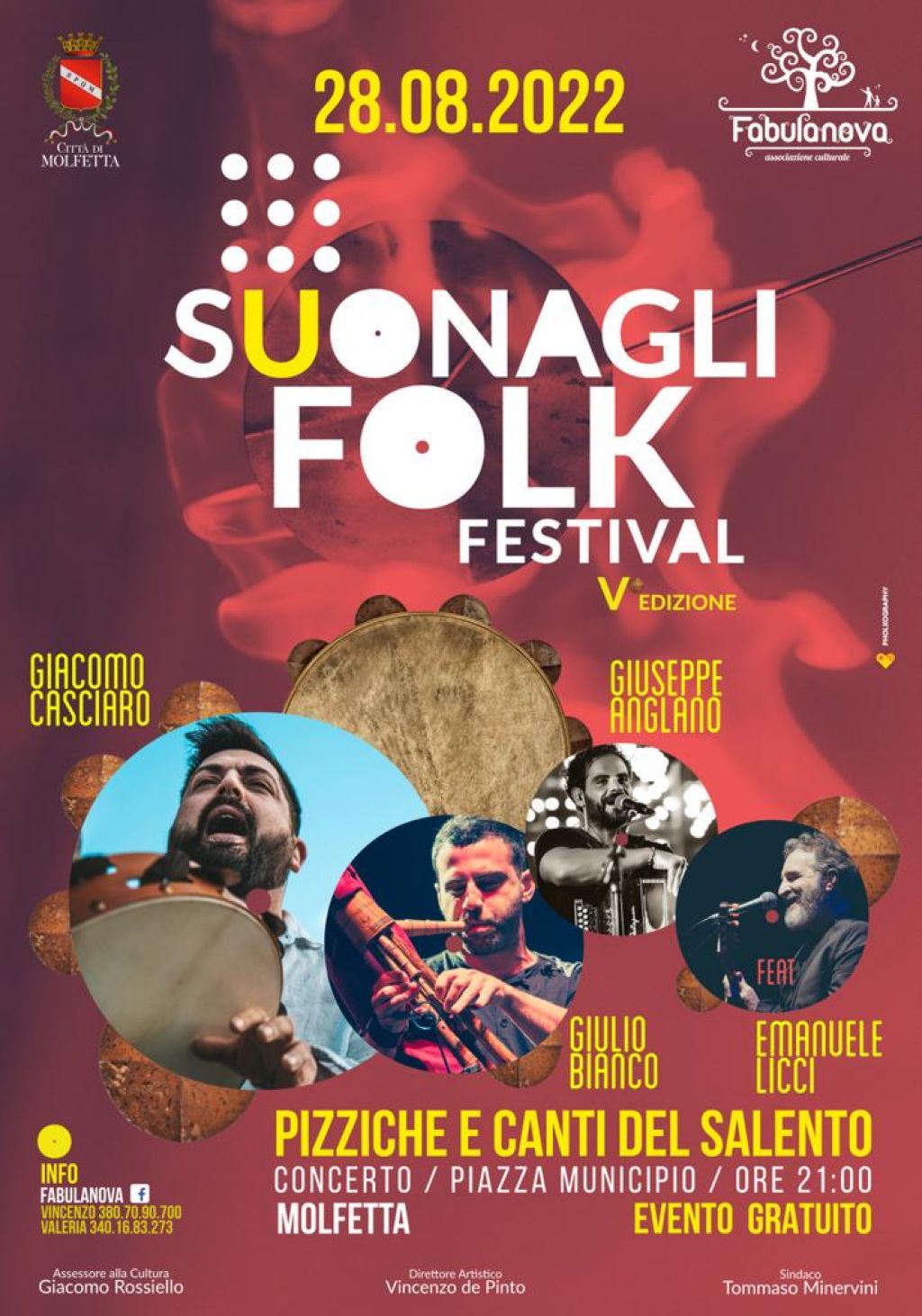 Domenica 28 agosto, in piazza Municipio, a partire dalle 21, a Molfetta, torna il Suonagli Folk Festival, con un concerto di pizziche e canti del Salento e la partecipazione di musicisti di grosso spessore con collaborazioni che vanno oltre la musica folk e vanno dal pop al rock, Stewart Copeland, Ludovico Einaudi, Goran Bregovic, Jovanotti, solo per citare alcuni nomi. L’ingresso è gratuito.
