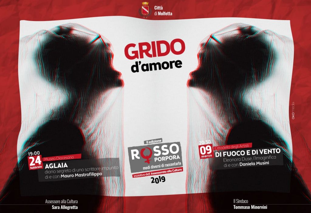 Due iniziative per raccontare il "Grido d'amore" delle donne. Riparte la Rassegna Rosso Porpora, che quest'anno è giunta alla seconda edizione. Il 24 febbraio 2019, presso il Museo Diocesano, alle ore 19, presentazione del libro dal titolo: Aglaia, Diario segreto di uno scrittore impunito, di Mauro Mastrofilippo. Ingresso libero.