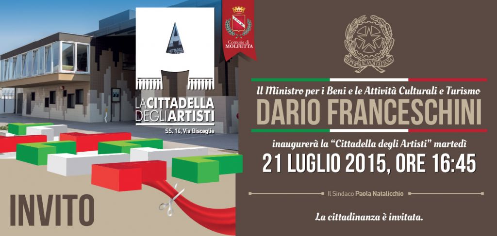 cittadellaMartedì 21 luglio 2015 alle ore 16.45 il Ministro dei Beni Culturali e Turismo On. Dario Franceschini inaugurerà a Molfetta la "Cittadella degli artisti" (ss 16, via Bisceglie) alla presenza del sindaco di Molfetta Paola Natalicchio, delle massime autorità civili, militari e religiose.