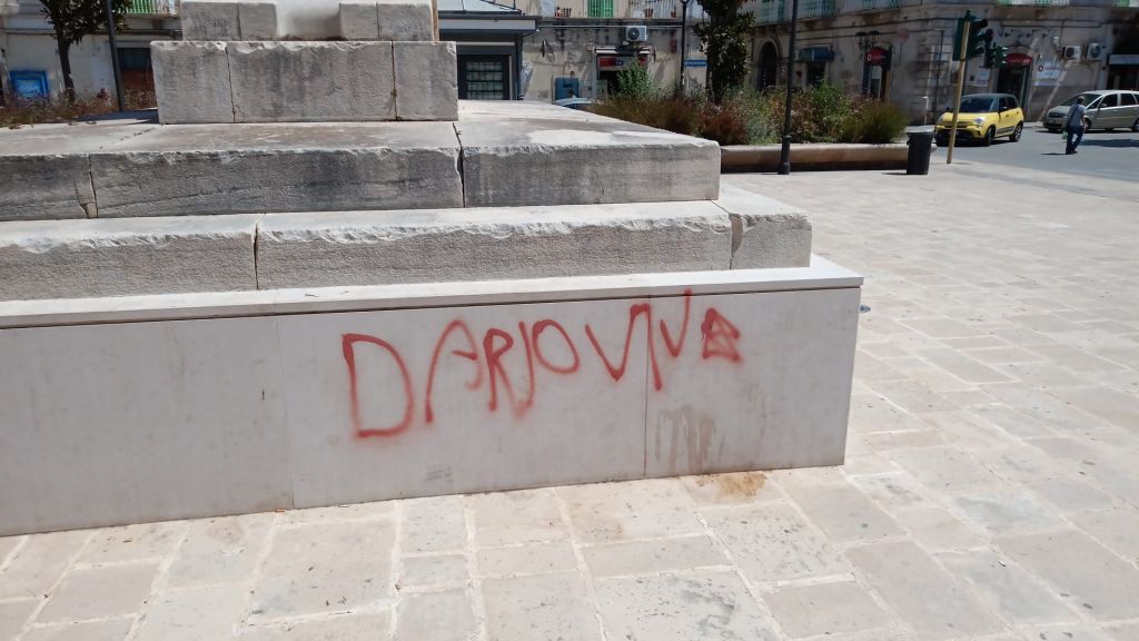 Da una parte c’è la bellezza dall’altra la stupidità. Imbrattata la base del monumento situato in piazza Margherita di Savoia restiuita alla città dopo una serie di interventi che ne hanno fatto un gioiello.