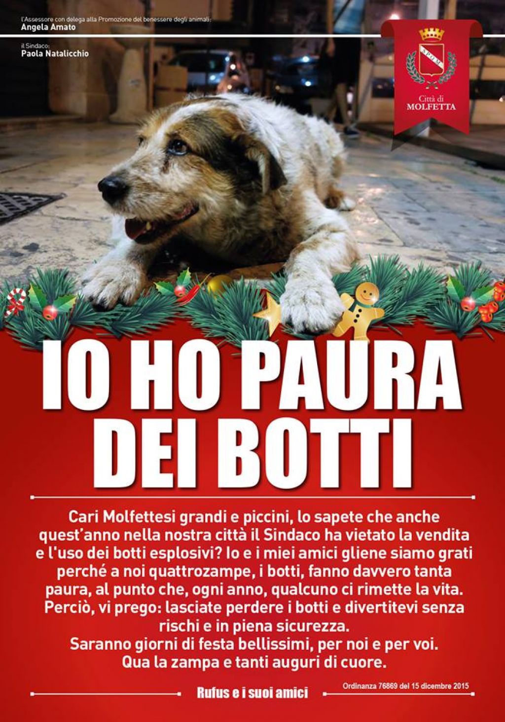"Sollecito - sottolinea l'assessore Angela Amato - la sensibilità dei molfettesi, grandi e piccoli, per esortarli a divertirsi senza usare i botti esplosivi. Gli animali, si sa, sentono i rumori in maniera amplificata rispetto agli umani e lo scoppio improvviso li terrorizza, inducendoli a reazioni incontrollate, pericolose per sé e per le persone. Abbiamo voluto accompagnare l'ordinanza sindacale con una campagna di sensibilizzazione che ha come protagonista Rufus, l'amico a quattro zampe di tutti i molfettesi che, ne sono certa, non potranno rimanere indifferenti al suo accorato appello. Mi unisco all'invito di Rufus: divertitevi in tutta sicurezza e saranno giorni gioiosi e bellissimi per tutti".