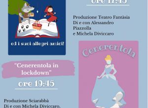 Alle 17.45 va in scena “Cappuccetto rosso ed i suoi allegri amici” una produzione del Teatro Fantàsia di e con Alessandro Piazzolla e Michela Diviccaro, alle 19.45 “Cenerentola in lockdown”, una produzione di Sciarabbà di e con Michela Diviccaro, Alessandro Piazzolla e Mariella Parlato.