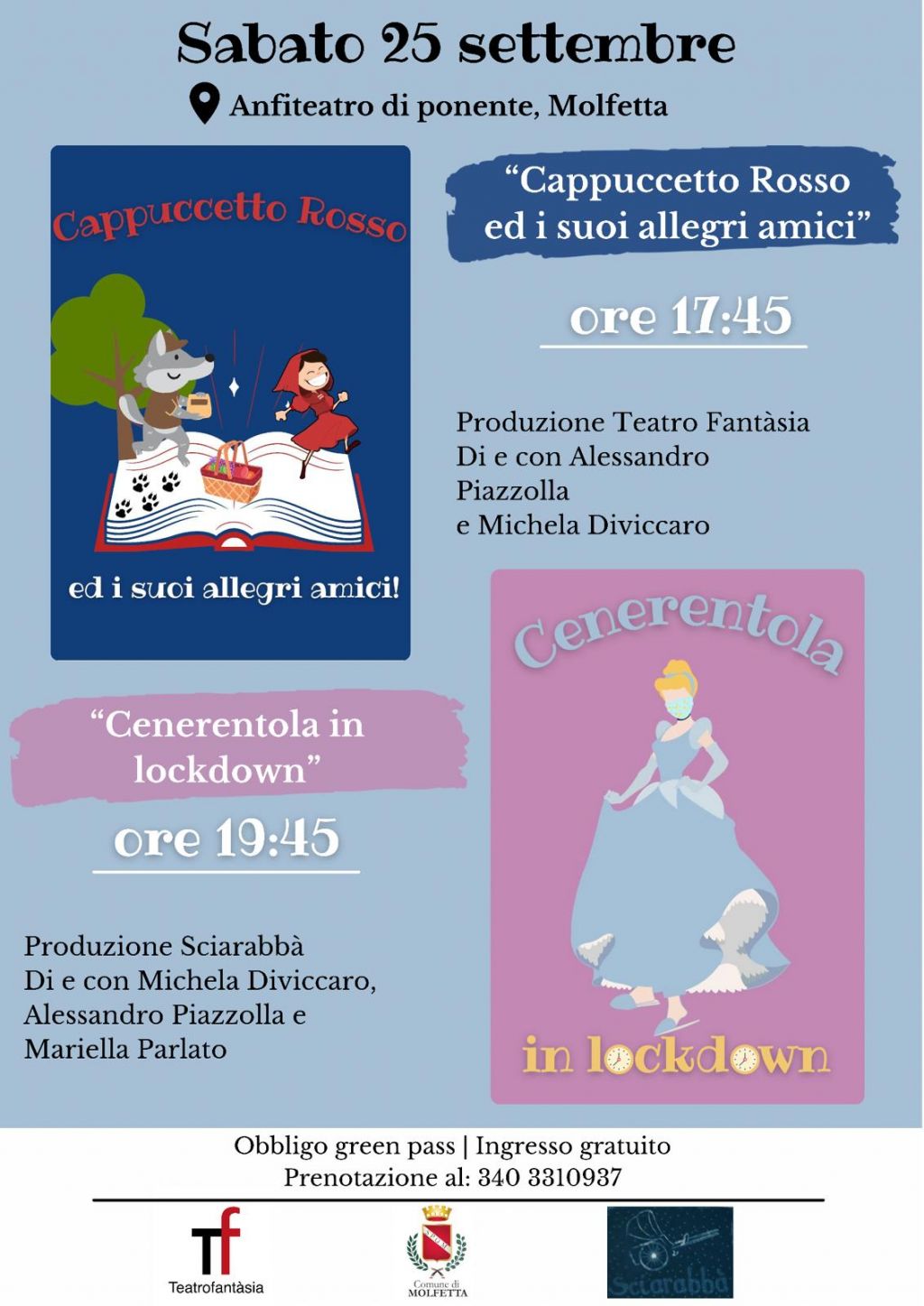 Sabato 25 settembre, nell’anfiteatro di ponente, a partire dalle 17.45, è di scena il teatro per i più piccoli con due spettacoli ad ingresso gratuito, ispirati ai grandi classici delle fiabe per bambini.
