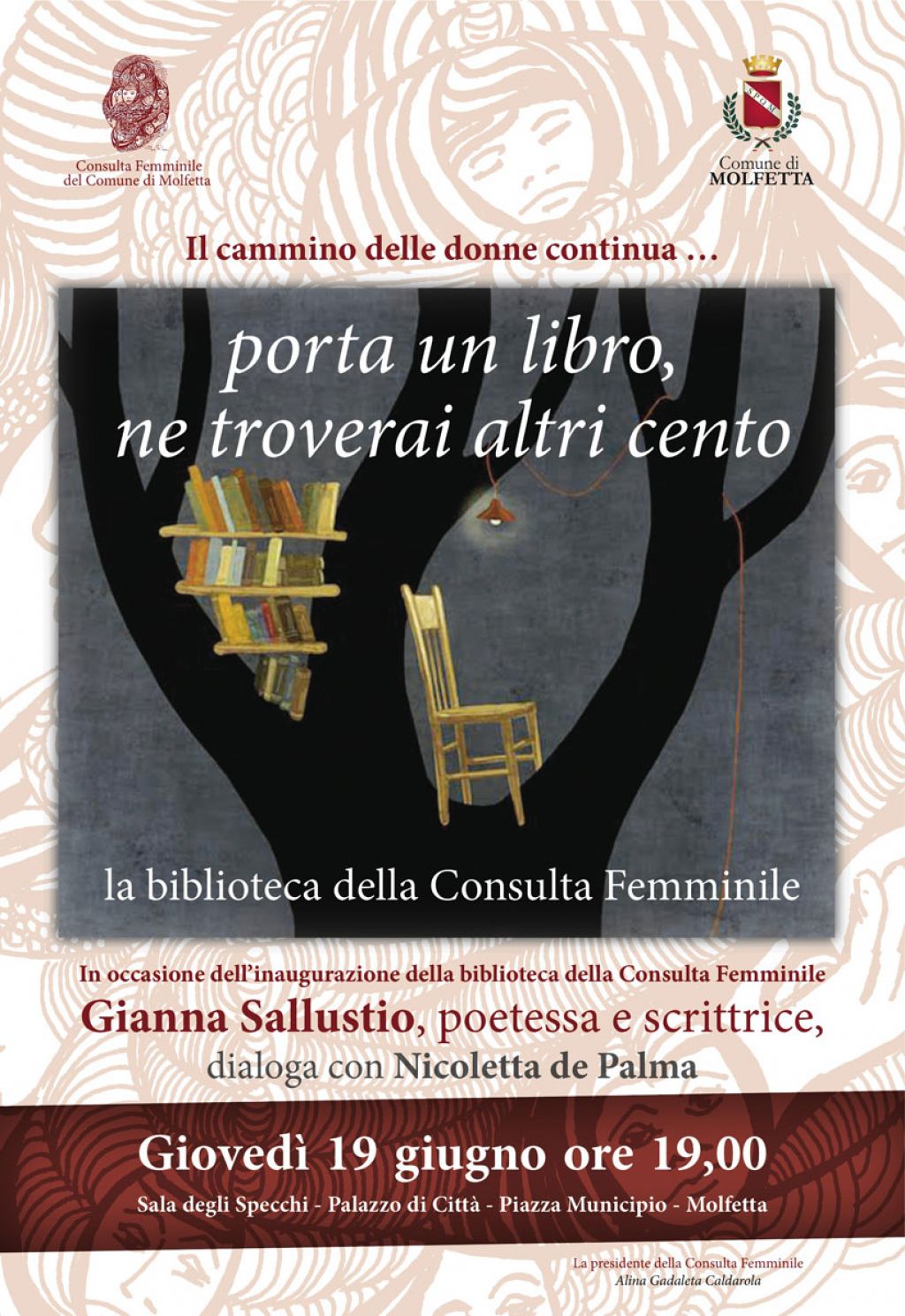 L'inaugurazione della biblioteca avverrà giovedì 19 giugno alle ore 19 presso la Sala degli Specchi - Palazzo di Città Piazza Municipio Molfetta.