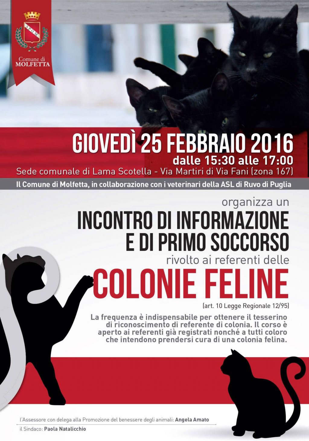 Si terrà giovedì 25 febbraio il primo incontro informativo per referenti di colonie feline. Dopo l'approvazione del riconoscimento delle colonie da parte della Giunta comunale, il Comune di Molfetta organizza, in collaborazione con i veterinari della Asl e con il nucleo ambientale della Polizia Municipale, un appuntamento per informare coloro che si sono registrati come referenti di colonia sulla normativa a tutela dei gatti randagi e sulle regole da rispettare a tutela del decoro urbano e dell'igiene pubblica. Saranno anche fornite nozioni basilari sulla salute dei gatti ed indicazioni di primo soccorso."Sono invitati a partecipare anche coloro che non sono ancora registrati come referenti e, magari, ci stanno pensando o, semplicemente, chi ha a cuore i gatti di strada" spiega Angela Amato, assessore alla promozione del benessere degli animali. "È importante che i cosiddetti gattari siano responsabilizzati rispetto ai loro compiti e che, nello stesso tempo, sia ufficialmente riconosciuto il loro impegno civico. I gatti randagi - conclude l'assessore Amato - sono tutelati dalla legge e sono un importante tassello dell'ecosistema cittadino ed è essenziale tenere sotto controllo la loro salute e la loro proliferazione: il ruolo dei referenti di colonia è fondamentale per la città".