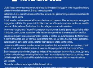 Il 4 novembre celebriamo la Festa dell’Unità nazionale nata sulle ceneri di anni di guerra, sul sacrificio di migliaia di giovani, uomini, donne, popolazione civile. Nessuno deve permettersi di rendere vano il loro sacrificio.