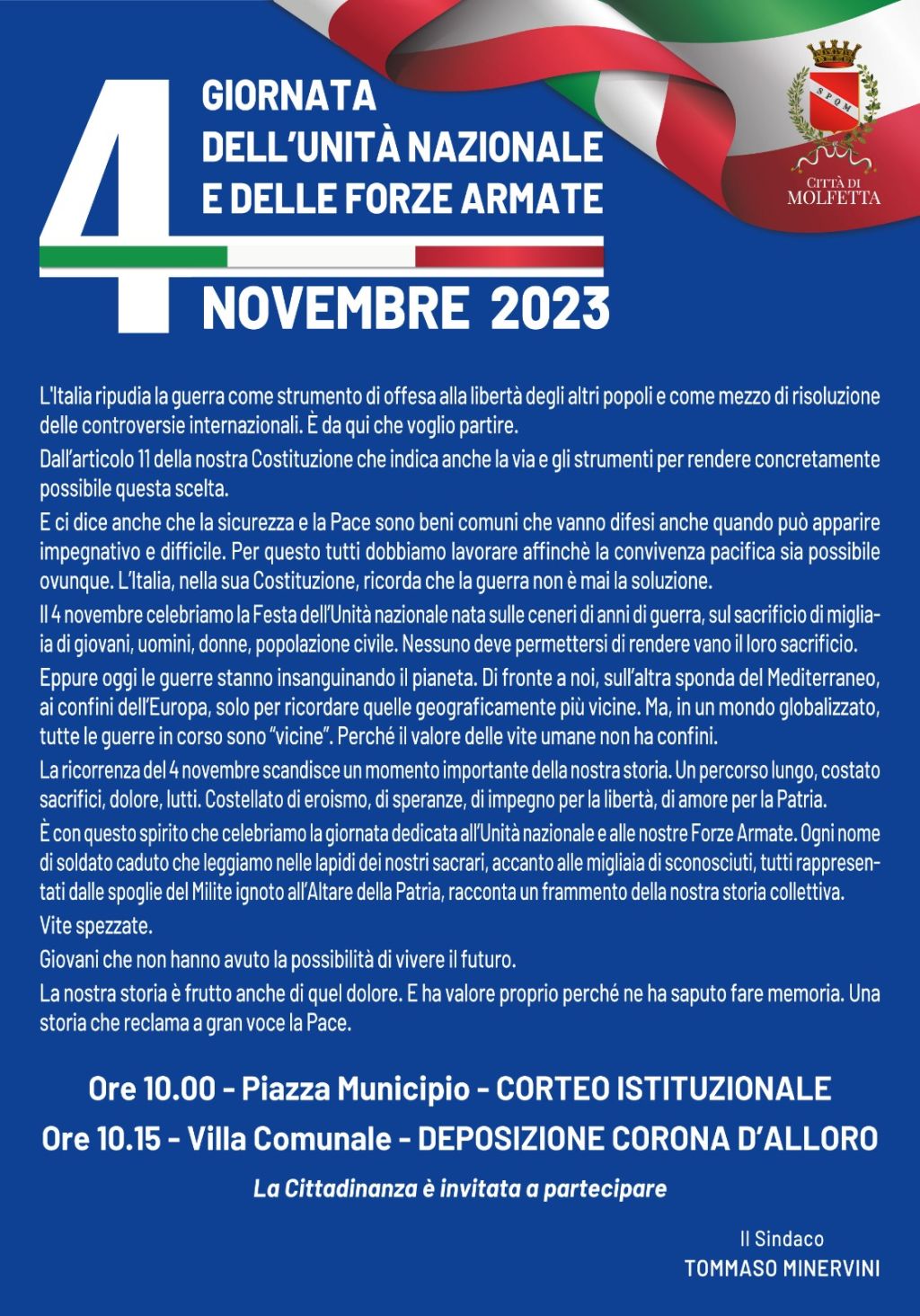 IV novembre. Giornata dell’Unità nazionale e delle Forze armate. Il messaggio del Sindaco Minervini