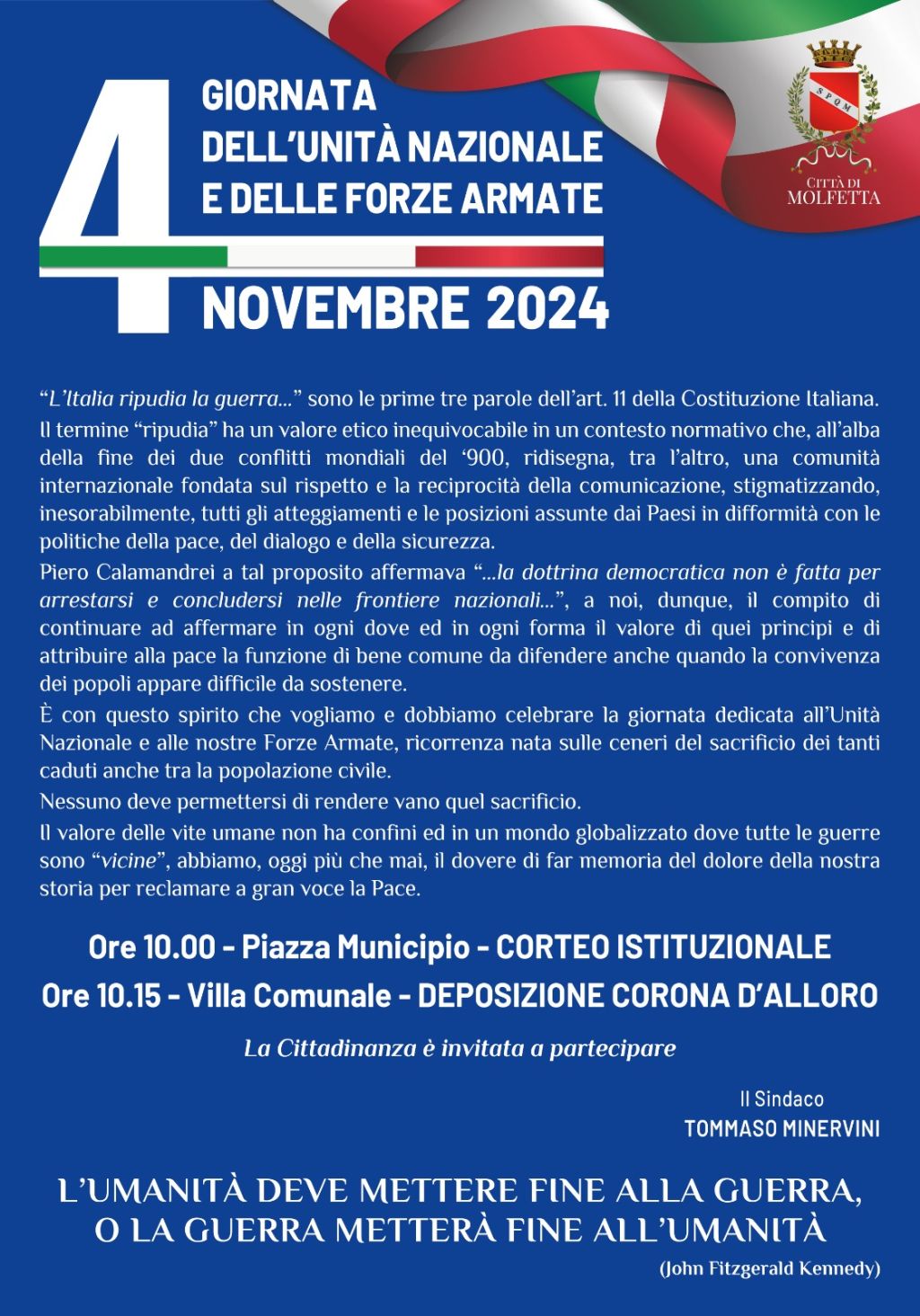 È con questo spirito che vogliamo e dobbiamo celebrare la giornata dedicata all’Unità Nazionale e alle nostre Forze Armate, ricorrenza nata sulle ceneri del sacrificio dei tanti caduti anche tra la popolazione civile.