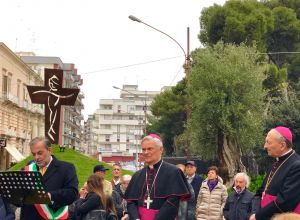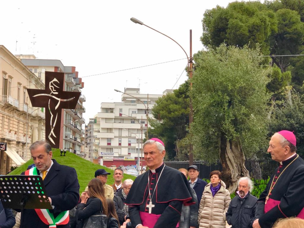 Sul palchetto, posizionato a due passi dalla Croce e dall’Ulivo che, da qualche giorno, impreziosiscono l’aiuola spartitraffico di piazza Garibaldi, il sindaco, Tommaso Minervini, il vescovo della Diocesi, monsignor Domenico Cornacchia, l’arcivescovo metropolita, monsignor Francesco Cacucci. Tutto intorno il popolo di don Tonino che neppure la pioggia è riuscito a fermare. Tutti insieme per assistere alla benedizione di un simbolo che, a perenne memoria, sarà lì a ricordo del Vescovo scomodo e del Papa che fece sosta nella sua città. Quella croce e quell’ulivo erano sul palco dal quale Papa Francesco il 20 aprile del 2018 celebrò, a Molfetta, la Santa messa.