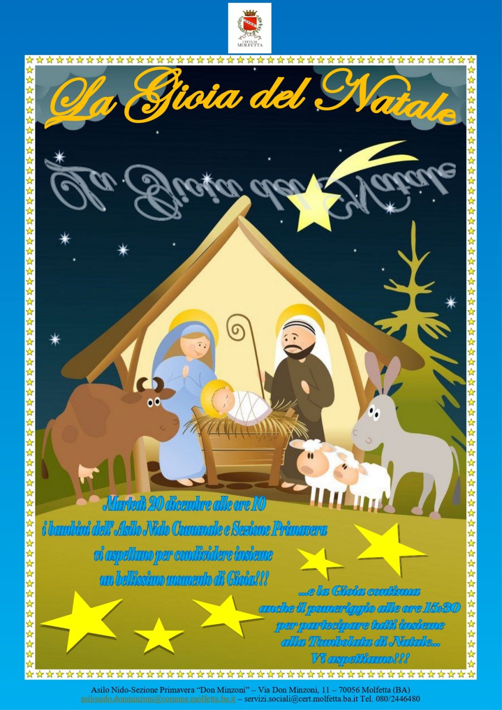 I bambini dell’Asilo Nido Comunale e Sezione Primavera a.e. 2022/2023 saranno lieti di condividere con le famiglie il Progetto “La Gioia del Natale”. L’evento si terrà martedì 20 dicembre alle ore 10:00... e la Gioia continuerà anche il pomeriggio alle ore 15:30 per partecipare tutti insieme alla Tombolata di Natale. Il tutto si svolgerà presso l'Asilo Nido Comunale, in via Don Minzoni, 11 Molfetta.