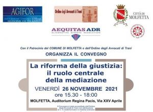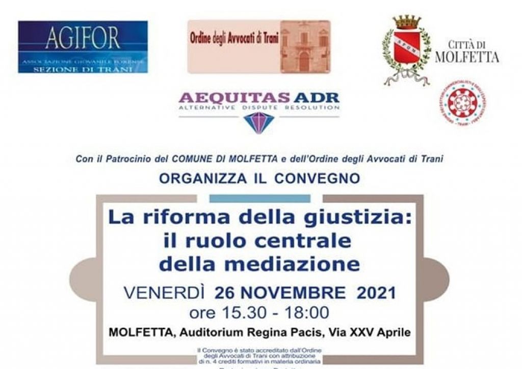 Il convegno si terrà a Molfetta, il prossimo 26 novembre, a partire dalle 15.30 nell’auditorium Regina Pacis. E’ organizzato da Aequitas Adr con il patrocinio del Comune di Molfetta, che da oltre un anno ha affidato con procedura di gara lo Sportello dedicato alla mediazione con sede nei locali della sede municipale di Via Carnicella.