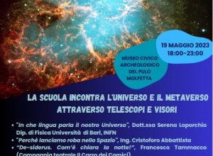 Si terrà a Molfetta, presso il Museo Civico Archeologico del Pulo, il 19 maggio, dalle ore 18 alle ore 23, “La Scuola incontra l’Universo e il Metaverso attraverso i telescopi e i visori”, evento, aperto al pubblico, promosso dall’Associazione UCIIM (Unione Cattolica Italiana Insegnanti, Dirigenti; Educatori, Formatori) e patrocinato dal Comune di Molfetta.