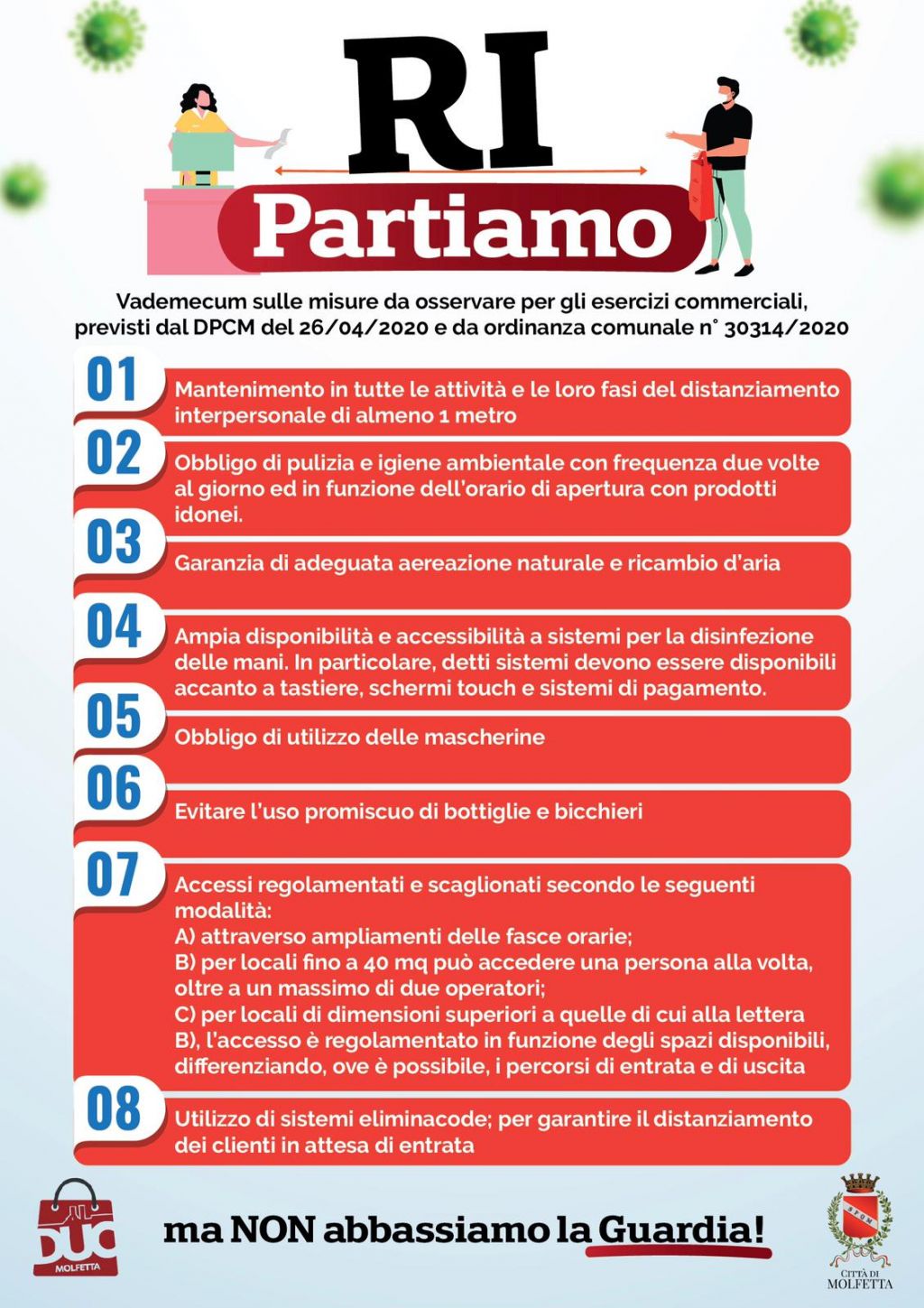 Un vademecum per le attività di ristorazione che offrono il servizio di asporto. Da oggi pomeriggio le associazioni di volontariato provvederanno alla consegna in tutte le attività commerciali della città delle locandine realizzate dal Comune di Molfetta e dal Duc, il Distretto urbano del commercio.