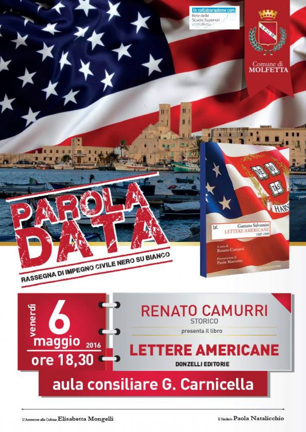 Parola data - CamurriPer la "Rassegna di impegno civile nero su bianco. Parola data" promossa dal Comune di Molfetta venerdì 6 maggio alle ore 18.30 presso la sala consiliare di Palazzo Giovene in Piazza Municipio, il prof. Renato Camurri presenterà "Lettere americane", il suo ultimo lavoro su Gaetano Salvemini.