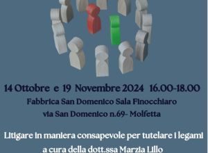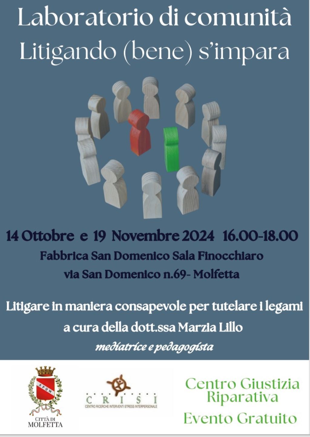 Il Centro di Giustizia Riparativa del Comune di Molfetta, gestito dalla cooperativa Crisi, organizza, domani 19 novembre, presso la Fabbrica San Domenico Sala Finocchiaro, via San Domenico n.69, dalle ore 16.00 alle 18.00, il secondo appuntamento con il laboratorio “Litigando (bene) s’impara”.