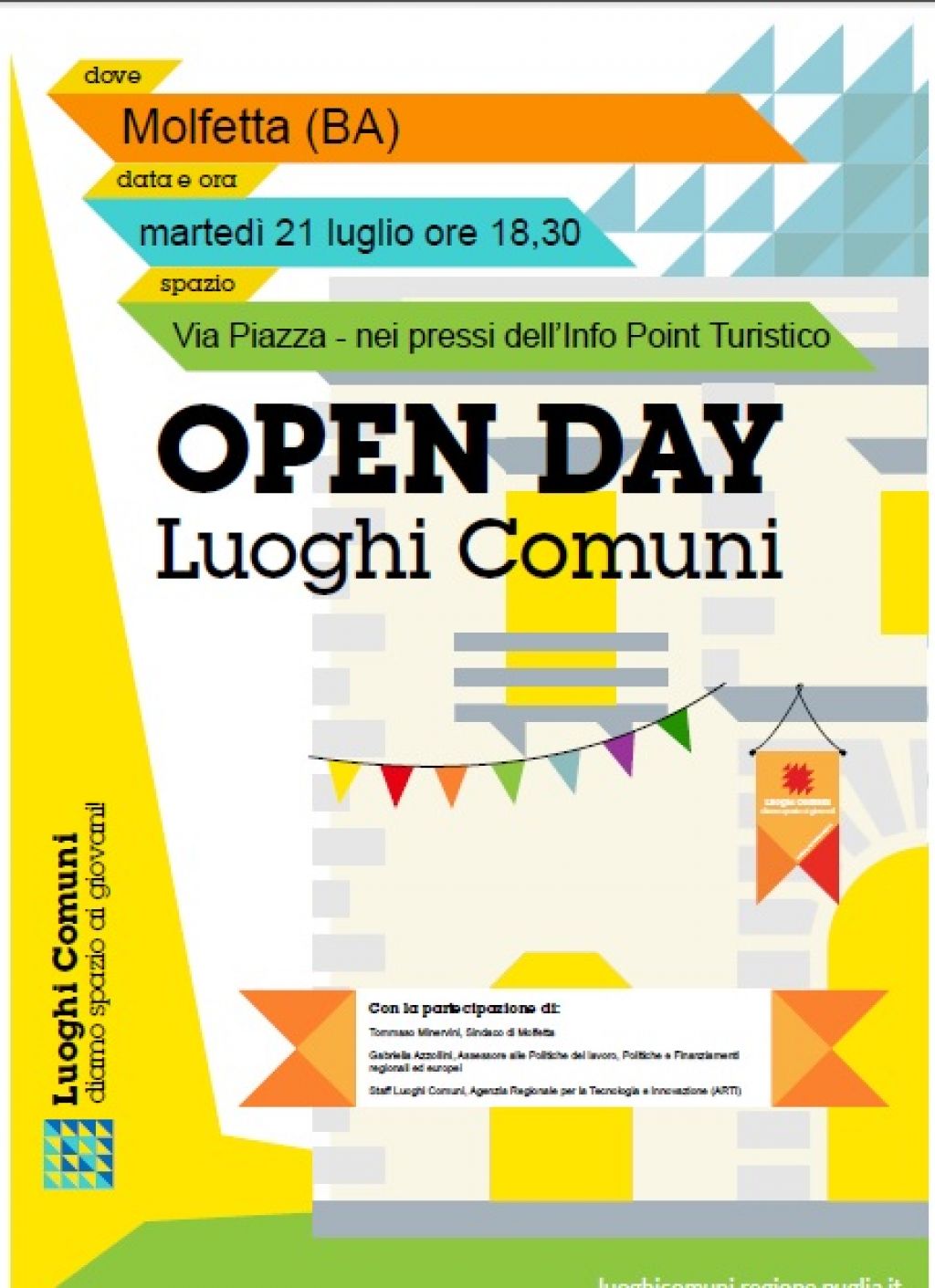 Luoghi Comuni, iniziativa della Regione Puglia promossa dalle Politiche Giovanili e dall’ARTI (Agenzia Regionale per la Tecnologia e l’Innovazione), attraverso la mappatura del patrimonio pubblico sottoutilizzato, mette in rete giovani ed Enti pubblici finanziando, con risorse fino a 40.000 euro, progetti rivolti al territorio e alle comunità.