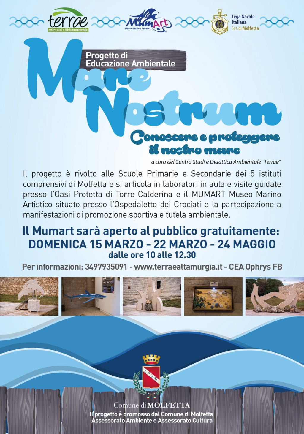 Il progetto, realizzato in collaborazione con l'Associazione MuMART - Museo Marino Artistico, Naturalia, Lega Navale Italiana - Sezione di Molfetta, Villaggio Lido Nettuno, è rivolto a Scuole Primarie e Secondarie si articola in lezioni, laboratori in aula riguardanti i temi di biologia marina ed ecologia marina per scoprire ciò che popola il Mare Nostrum e ciò che ne sta mettendo a rischio la sopravvivenza. Al termine delle attività in aula segue la visita guidata presso l'Oasi Naturale di Torre Calderina per scoprire gli aspetti naturalistici e storici dell'area. Infine, viene presentato ai ragazzi il Museo Marino Artistico MuMART presso l'Ospedaletto dei Crociati a Molfetta. Il MuMART nasce grazie al progetto regionale Bollenti Spiriti 2012 e racchiude in sé arte e ambiente in una simbiosi perfetta. Ci sono le sculture progettate da giovani artisti pugliesi dell'IISS De Nittis-Pascali di Bari e realizzate in Pietra Rosa di Trani dall'Azienda VAMAR snc di Bisceglie, mentre all'interno del MuMART i ragazzi vedono le varie sezioni del Museo.
