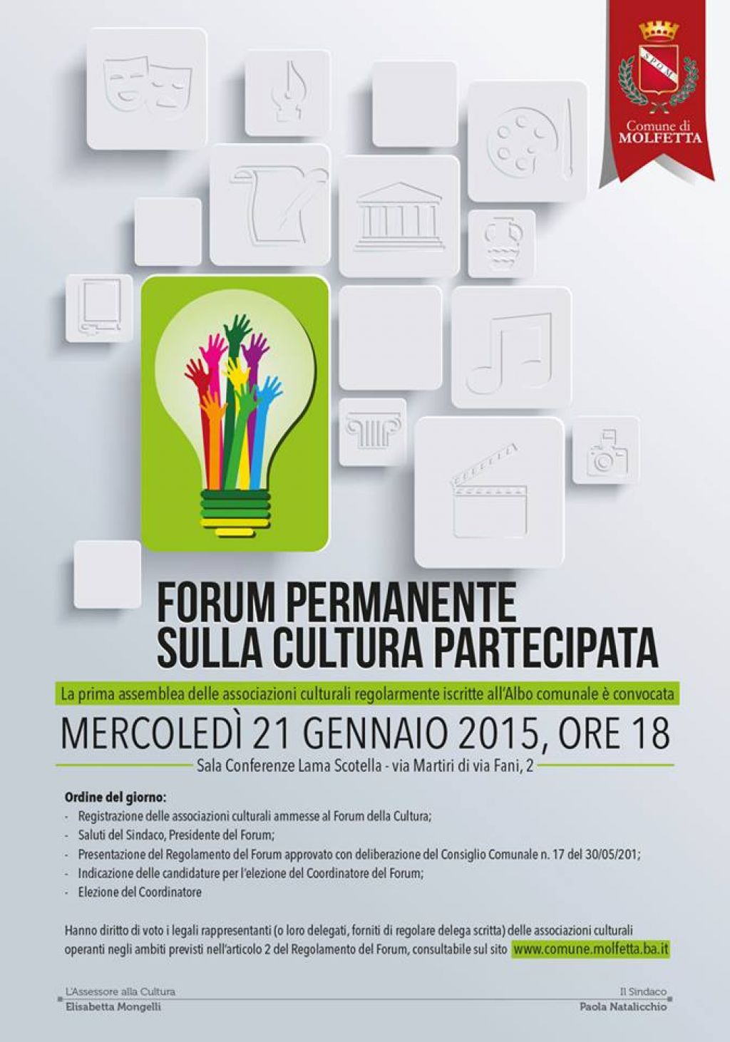 Manifesto forum della culturaMercoledì 21 gennaio alle ore 18 nella sala conferenze della sede comunale di Lama Scotella (via Martiri di via Fani, 2) è convocato il Forum della Cultura, istituito con delibera di Consiglio Comunale n. 17 del 2014, ai sensi dell'art. 57 dello Statuto Comunale, quale organismo permanente di incontro e reciproco confronto fra le associazioni e le libere forme di aggregazione operanti in città nel campo artistico e culturale.