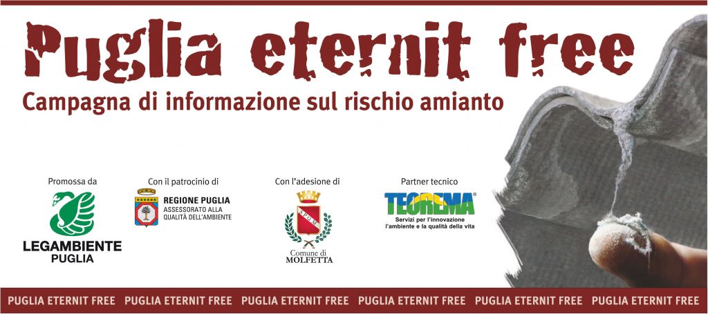 Anche il Comune di Molfetta aderisce a "Puglia Eternit Free", la prima campagna regionale di informazione sul rischio amianto promossa da Legambiente Puglia, con il patrocinio dell'Assessorato alla Qualità dell'Ambiente della Regione Puglia e con la collaborazione del partner tecnico Teorema Spa, mirata alla rilevazione statistica di amianto nelle aree urbane, industriali e agricole, così come disposto dalla legge n. 257/92 e dal Piano Regionale Amianto della Regione Puglia che prevede, tra l'altro, l'avvio del censimento obbligatorio.Lunedì 18 gennaio alle ore 11 è programmata la conferenza stampa di presentazione nella sala riunioni della sede comunale di Via Martiri Di Via Fani. Interverranno: Paola Natalicchio, Sindaco del Comune di Molfetta, Rosalba Gadaleta, Assessore all'ambiente del Comune di Molfetta, Francesco Tarantini, presidente di Legambiente Puglia, Tommaso Forte, Responsabile relazioni esterne di Teorema Spa.