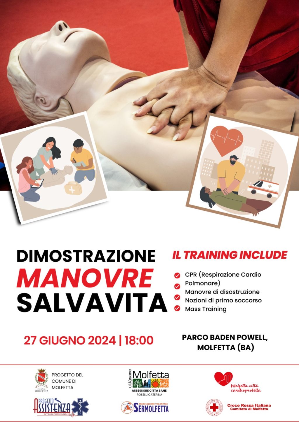A partire dalle 18, domani 27 giugno, nel parco Baden Powell, ci saranno attività di mass training e manovre salvavita a cura della cooperativa Progetto Assistenza e Sermolfetta; simulazioni di primo soccorso con simulatori specializzati a cura della Croce Rossa; e poi l’ambulanza dei pupazzi per diffondere, sempre a cura della Croce Rossa, la conoscenza delle manovre salavavita anche tra i più piccoli. In apertura ci saranno i saluti del sindaco, Tommaso Minervini, e dell’assessore Caterina Roselli.
