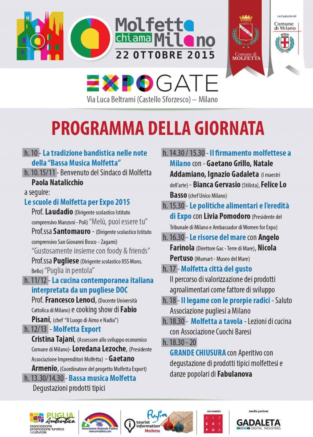 Tutto pronto per Molfetta chiama Milano, la giornata-evento organizzata domani, giovedì 22 ottobre, dal Comune di Molfetta presso l'Expo Gate in Piazza Sforza, che metterà al centro le storie dei professionisti e delle realtà produttive molfettesi che si sono fatte largo nel capoluogo lombardo nell'ambito della cucina, dell'arte, della moda, delle produzioni agroalimentari di qualità."Abbiamo scelto - spiega il sindaco di Molfetta Paola Natalicchio - di essere a Milano nell'ultima settimana dell'Expo con i riflettori dell'Italia accesi. La città è attraversata da importanti flussi turistici e noi collochiamo Molfetta al centro di questo circuito, a pochi passi dal Castello, nel cuore del capoluogo lombardo. Apriamo le porte dell'Expo Gate e facciamo incontrare le nostre realtà produttive impegnate nel progetto molfettaexport.com con le esperienze di politiche di sviluppo economico del Comune di Milano, raccontiamo come, partendo dalla valorizzazione della biodiversità dei nostri prodotti agricoli e dell'innovazione nel campo della pesca e dell'agroalimentare, intendiamo introdurre Molfetta nella rete delle città del gusto. Tributiamo un importante riconoscimento agli chef stellati molfettesi che fanno grande la nostra cucina e riabbracciamo i maestri dell'arte e tutti i professionisti che studiano, lavorano, vivono a Milano e devono sentirsi parte della nostra comunità cittadina. Per l'amministrazione non si tratta solo di un evento ma di una occasione per tenere vivo il laboratorio di idee sulle opportunità di sviluppo".