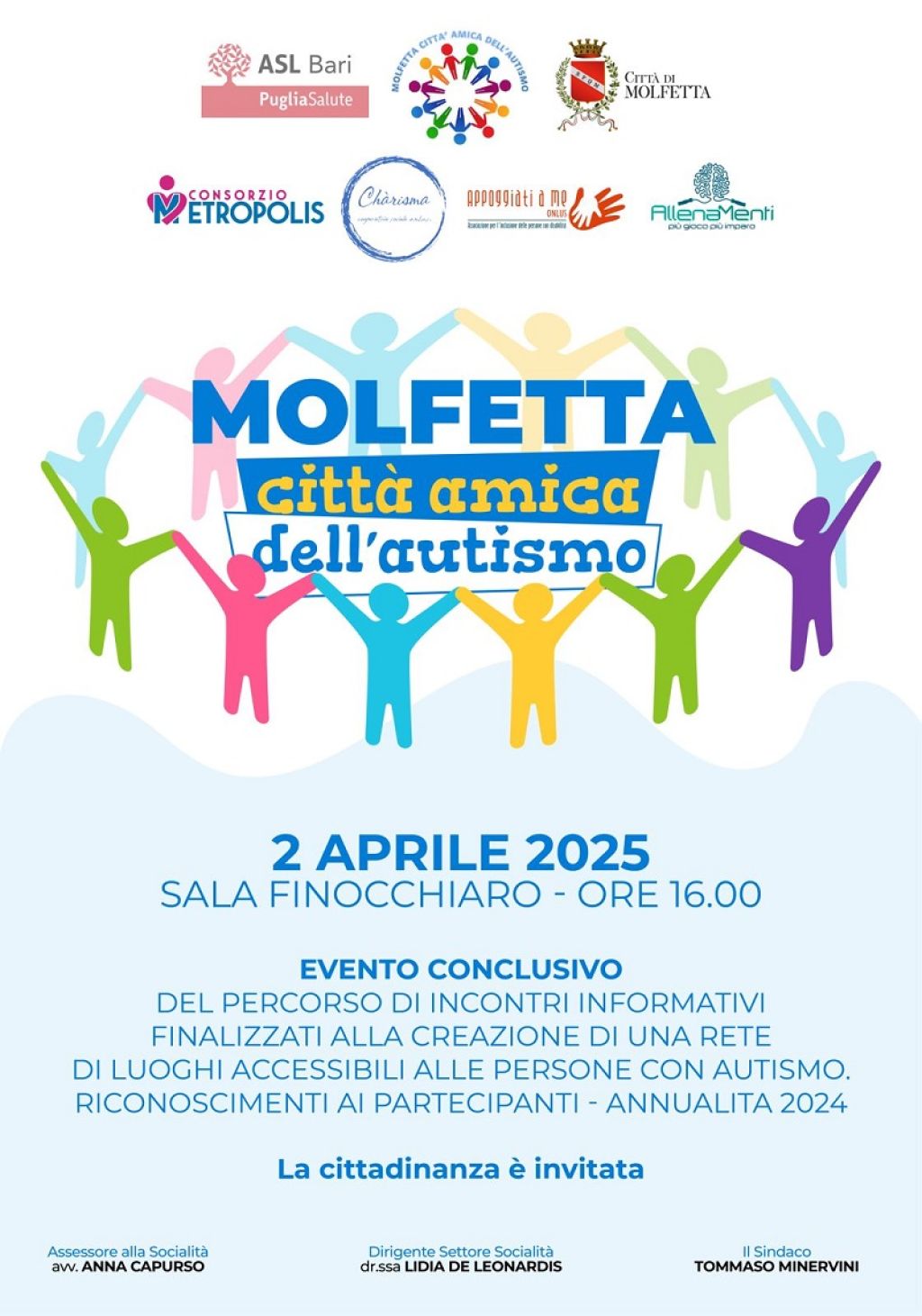 Mercoledì 2 aprile, nella sala Finocchiaro della Fabbrica di San Domenico, a partire dalle ore 16, cerimonia conclusiva del progetto “Molfetta Città amica dell’autismo”, annualità 2024.