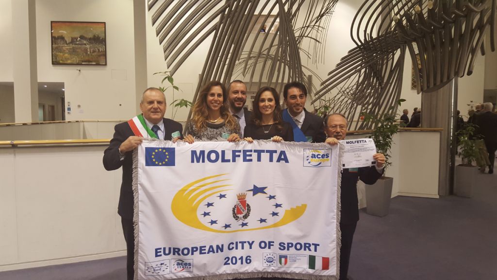 Bruxelles3Molfetta è ufficialmente città europea dello sport, unica in Puglia e tra le 31 comunità europee che hanno deciso il prossimo anno di investire nella promozione dei valori sportivi. Ieri pomeriggio al Parlamento europeo c'è stato il passaggio di testimone tra le Capitali dello sport: Torino 2015 e Praga 2016 e la consegna delle Bandiere per le città europee, rilasciate da Aces Europe.