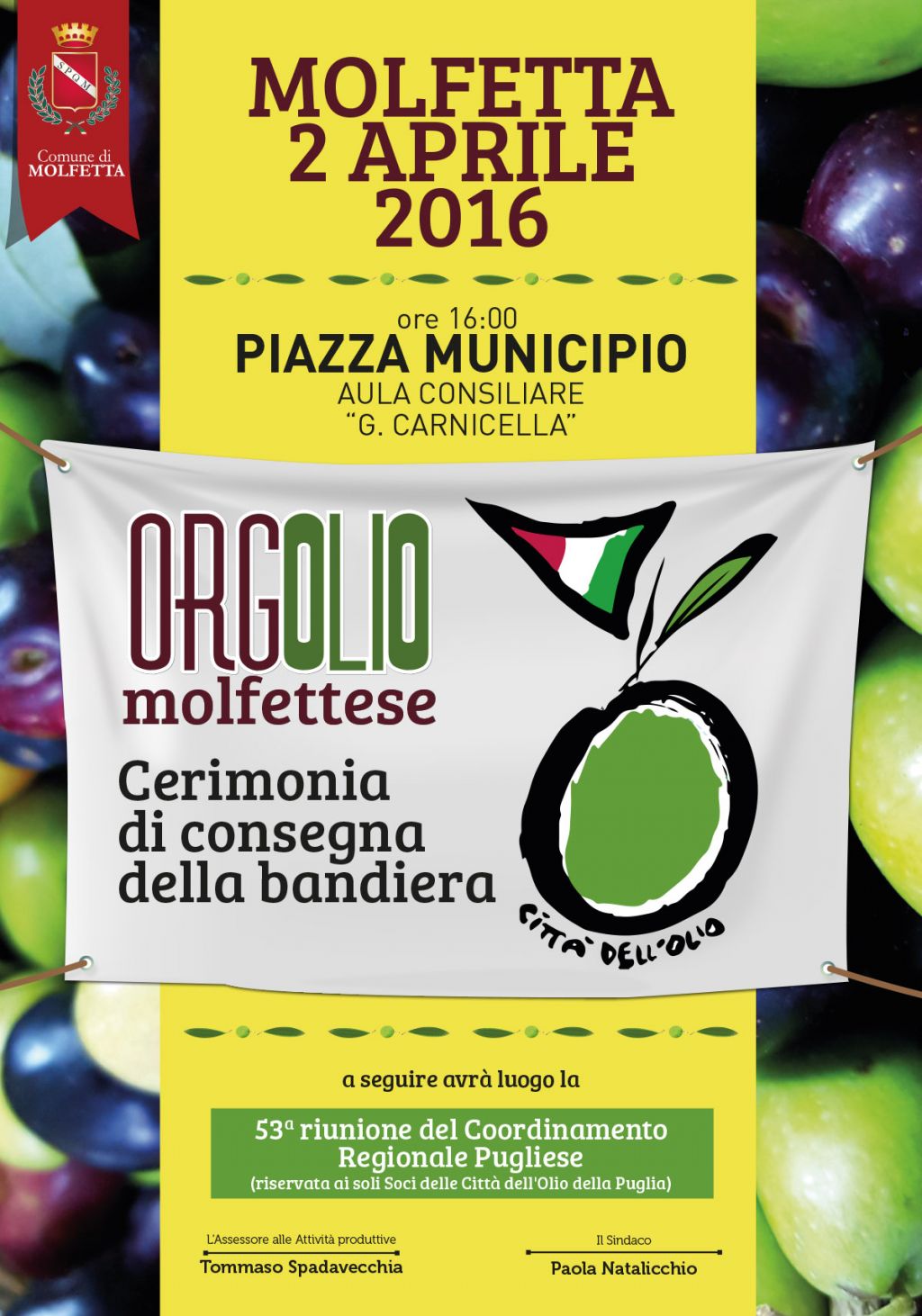 "OrgOlio Molfettese. Avevamo definito così la prima partecipazione del nostro Comune con tutti i produttori a Olio Capitale a Trieste, la più importante fiera specializzata per le produzioni di olio extravergine d'oliva in Italia. E domani saremo orgogliosi di ospitare a Molfetta il 53° coordinamento regionale pugliese delle Città dell'Olio e ricevere la bandiera che ufficializza il nostro ingresso in questa prestigiosa rete. Una insegna che esporremo agli ingressi della città non come motivo di vanto ma come promemoria per continuare a costruire percorsi di valorizzazione e promozione di questa eccellenza". Così il sindaco di Molfetta Paola Natalicchio annuncia l'appuntamento che domani alle ore 16 nell'aula Consiliare richiamerà tutti i produttori olivicoli e i cittadini che vorranno assistere alla cerimonia.