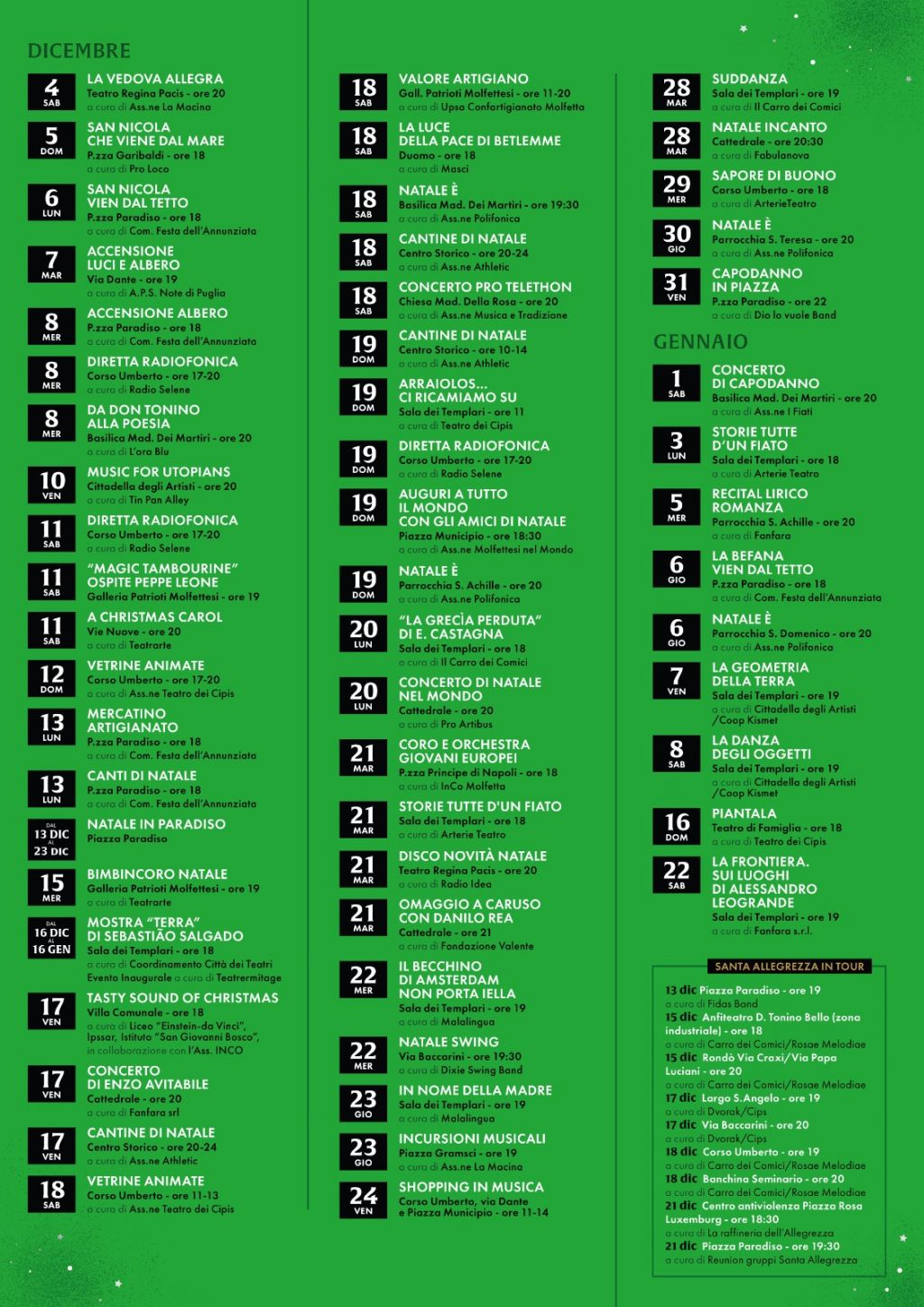 Particolarmente ricco il cartellone di “Molfetta in luce”, rassegna di eventi predisposta in occasione delle fesstività di fine anno dal Comune di Molfetta (assessorati al Marketing territoriale e Cultura) e dal Distretto urbano del commercio.