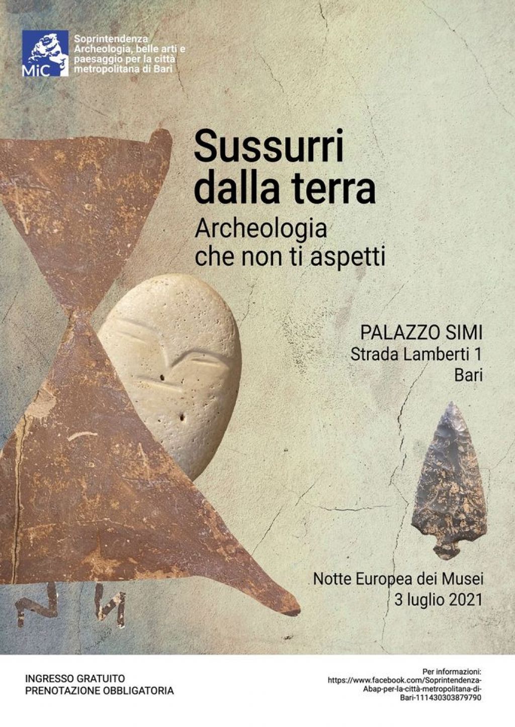 Sabato 3 luglio, in occasione dell’edizione 2021 della Notte Europea dei Musei, la Soprintendenza Archeologia, belle arti e paesaggio per la città metropolitana di Bari riapre al pubblico, con la mostra “Sussurri dalla terra. Archeologia che non ti aspetti”, le sale espositive di Palazzo Simi, a Bari.