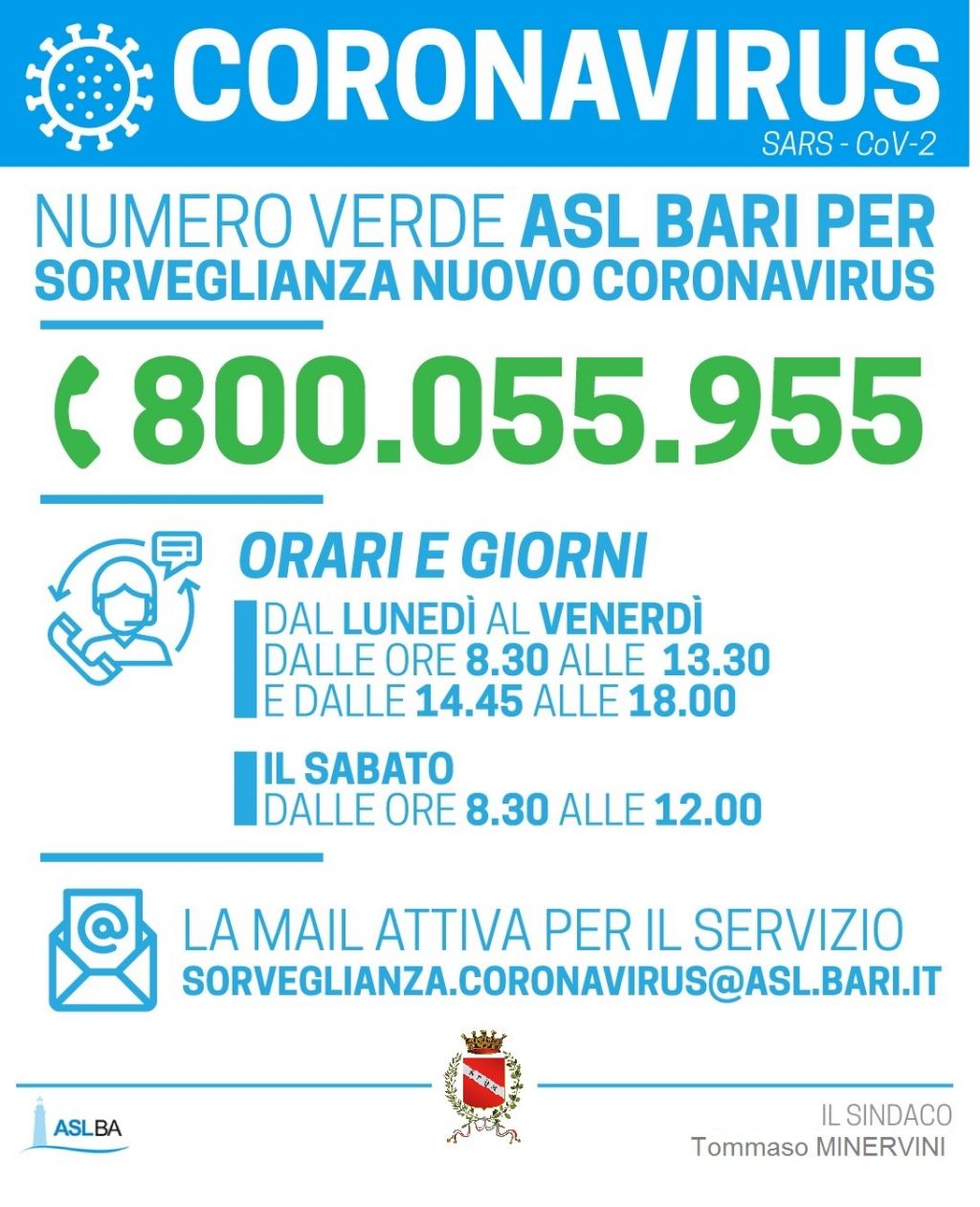 La Asl Bari ha attivato un numero verde, 800055955, a cui tutti i cittadini possono fare riferimento per avere chiarimenti sul Coronavirus. Contestualemnte è stata attivata anche la mail sorveglianza.coronavirus@asl.bari.it.
