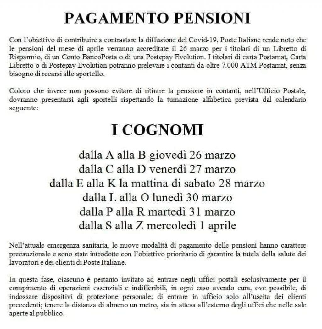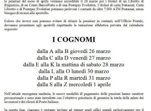 Nei mesi di aprile, maggio e giugno il pagamento delle pensioni presso gli sportelli postali anticipato rispetto alle normali scadenze e verrà distribuito su più giorni.