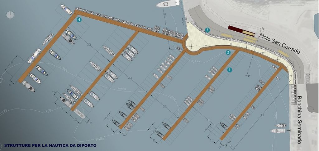 I nuovi attracchi dei pescherecci saranno realizzati lungo Banchina San Domenico. I pontili di attracco saranno realizzati su Banchina San Corrado a pochi metri dal Duomo.