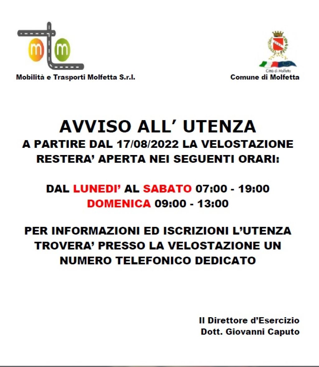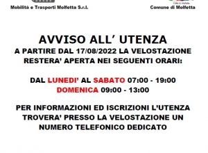 A partire dal 17/08/2022 la velostazione resterà aperta nei seguenti orari: