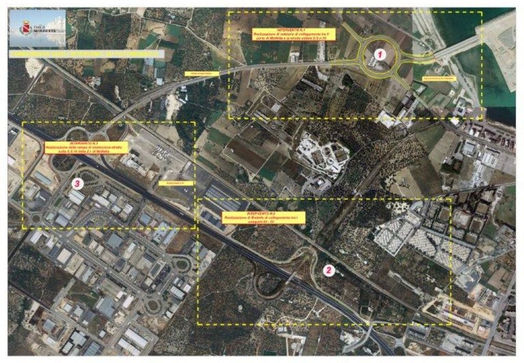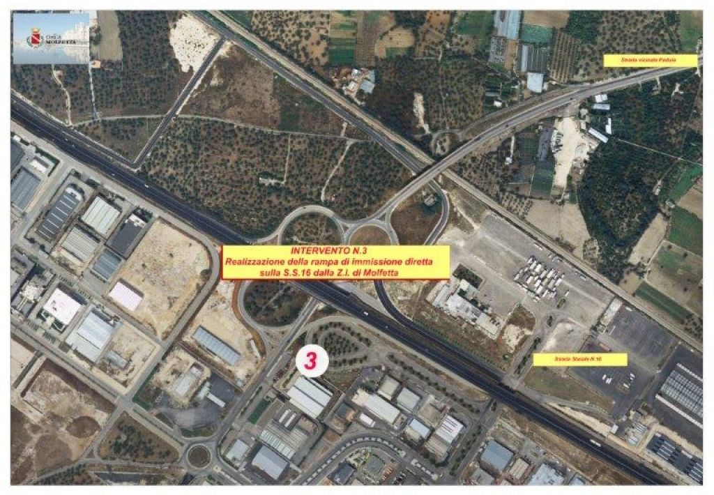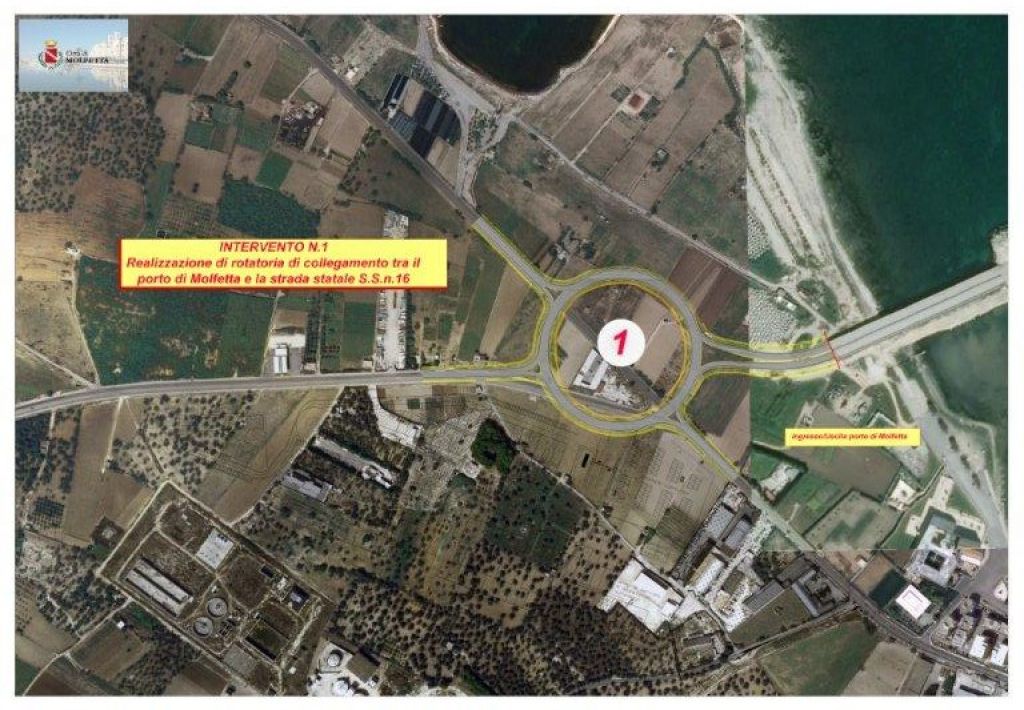 Il Comune cofinanzierà gli interventi per la progettazione e realizzazione di una quota parte della rotatoria lato mare, per consentire il collegamento in sicurezza dalla statale ex S.S.16 al porto, eliminando la rotatoria provvisoria esistente e lasciando inalterato l'accesso alla ex S.S.16 dalla strada vicinale Padula. L'intervento si configura come attuazione di precisa prescrizione da parte del Ministero dell'Ambiente e Tutela del Territorio che poneva l'intervento in argomento quale condizione essenziale per la compatibilità ambientale del Piano Regolatore Portuale di Molfetta.