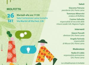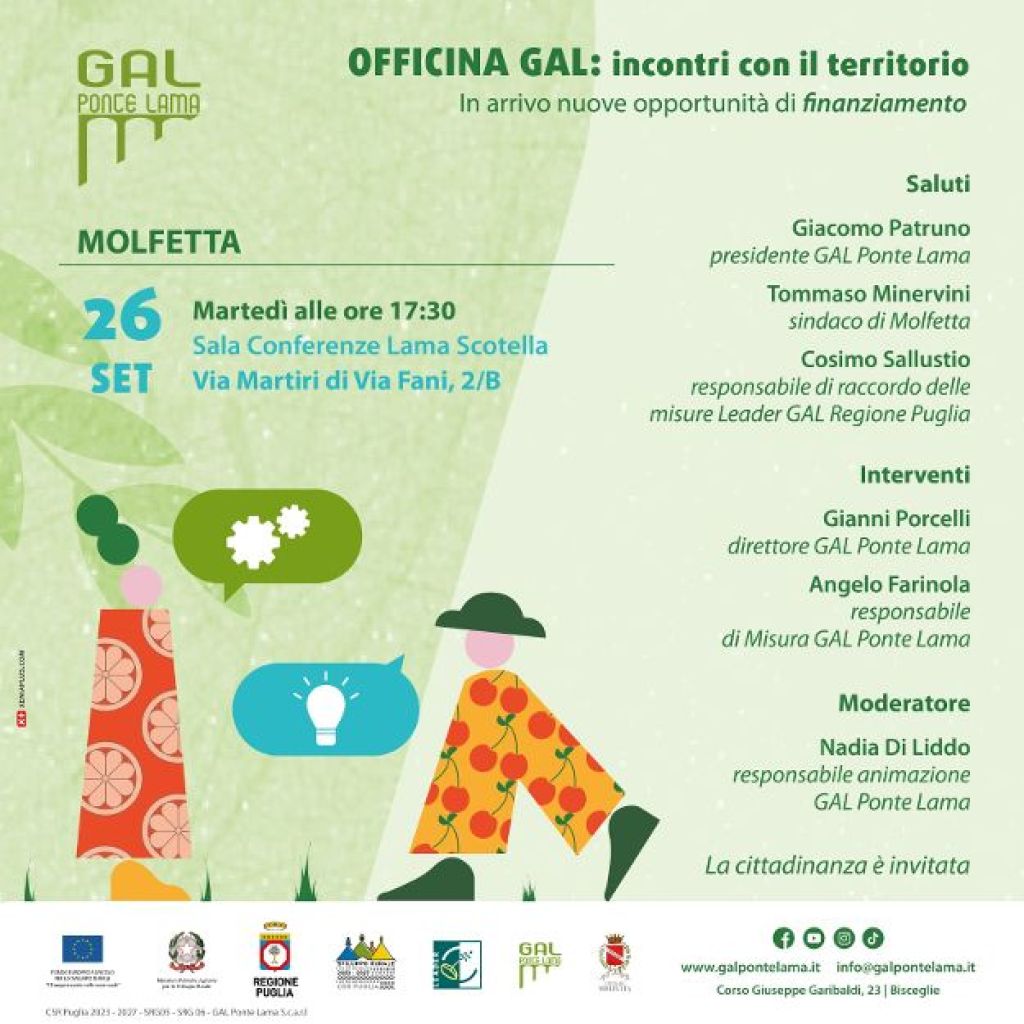 Martedì 26 settembre alle ore 17.30 nella sala conferenze della sede comunale di via Martiri di Via Fani, a Molfetta, Incontro con il Territorio, organizzato dal GAL Ponte Lama, per presentare i risultati tangibili dell’attività svolta sin dalla sua costituzione, ma soprattutto per accogliere istanze, bisogni ed in particolare idee progettuali intorno alle quali costruire la nuova Strategia di Sviluppo Locale 2023-2027.