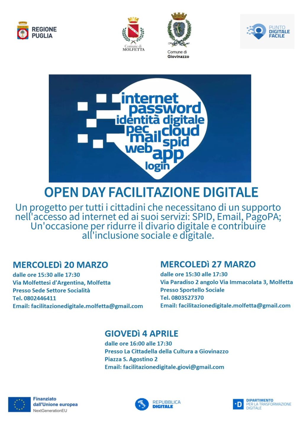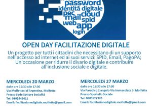 La cittadinanza, gli organismi del Terzo Settore Sociale e tutti coloro che sono interessati ad acquisire servizi digitali e informazioni utili per l’utilizzo delle piattaforme informatiche sono invitati agli Open day che si terranno, mercoledì 20 marzo, dalle 15.30, alle 17.30, nella sede comuanale del Settore socialità, in Via Molfettesi d’Argentina; mercoledì 27 marzo, presso gli uffici in Via Immacolata dalle 15.30 alle 17.30; l’ultimo, giovedì 4 aprile, a Giovinazzo, dalle 16 alle 17.30, presso la Cittadella della cultura, in piazza Sant’Agostino.