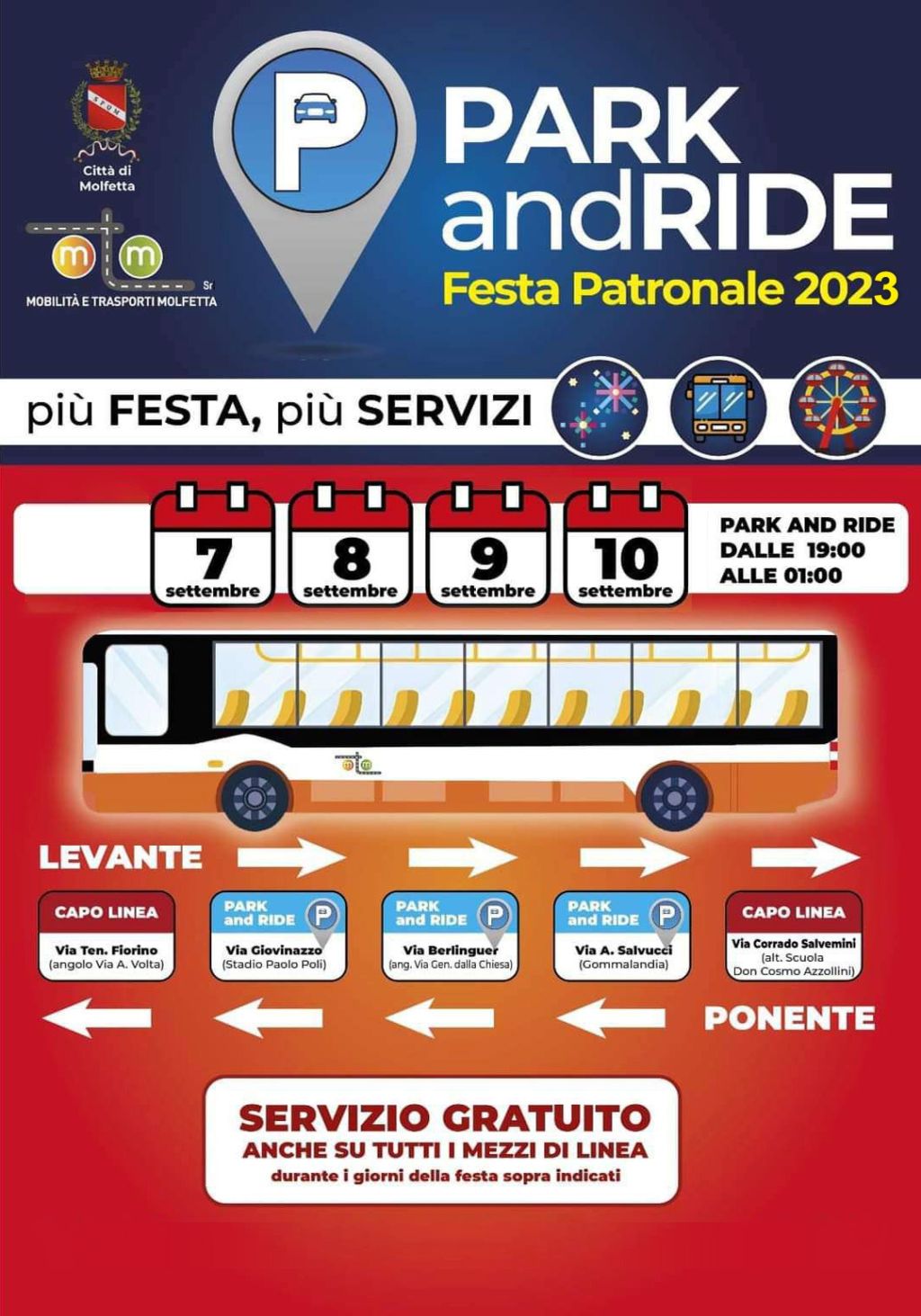 Dal 7 al 10 settembre, nei giorni della festa patronale, Park&ride e linee urbane gratuite per tutti. La decisione è stata assunta dall’amministrazione comunale d’intesa con i vertici della Mtm, l’azienda che, a Molfetta, si occupa della mobilità pubblica urbana.